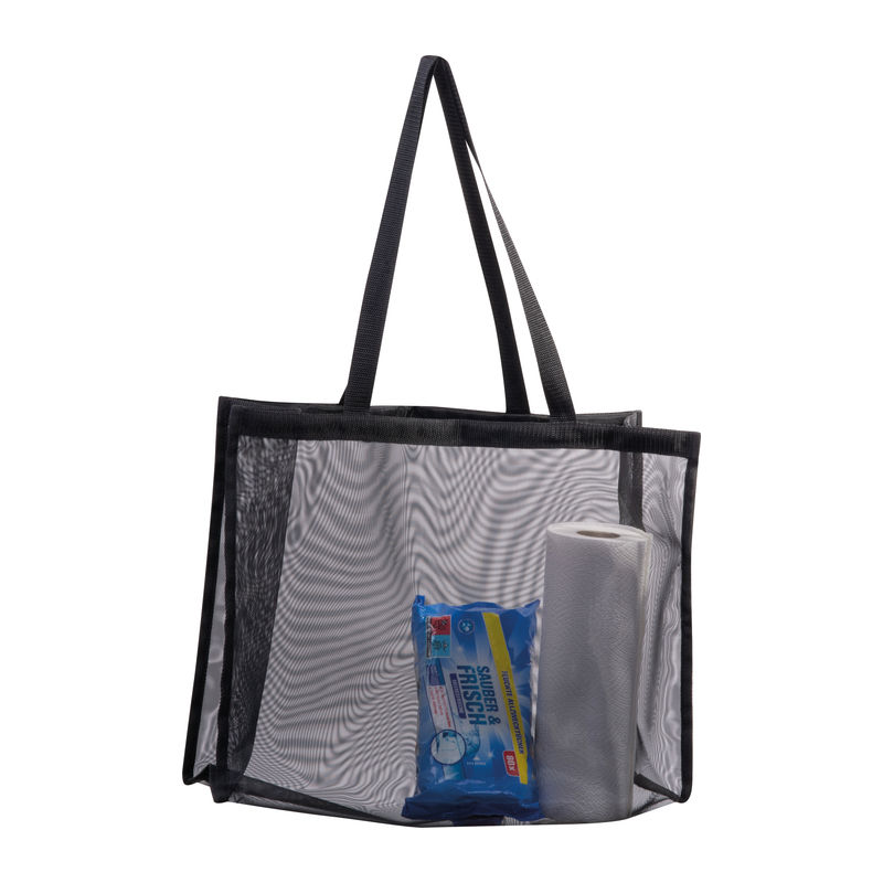 Large, transparent beach or shopping bag made of polyester with long carrying handles.