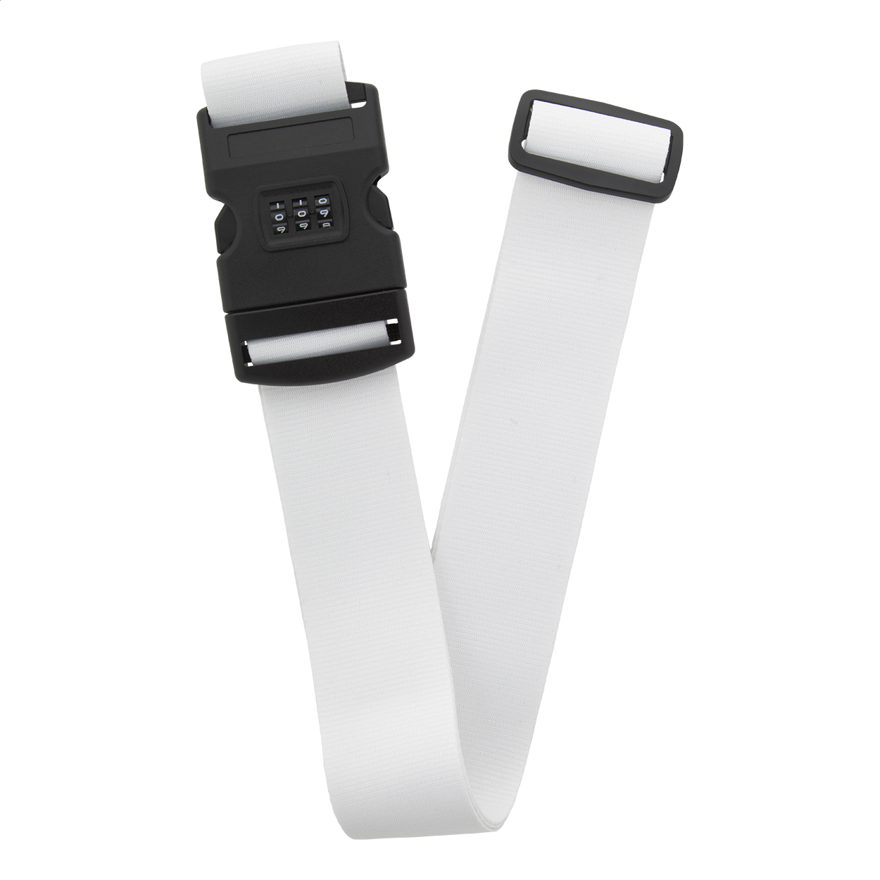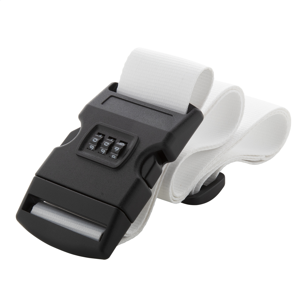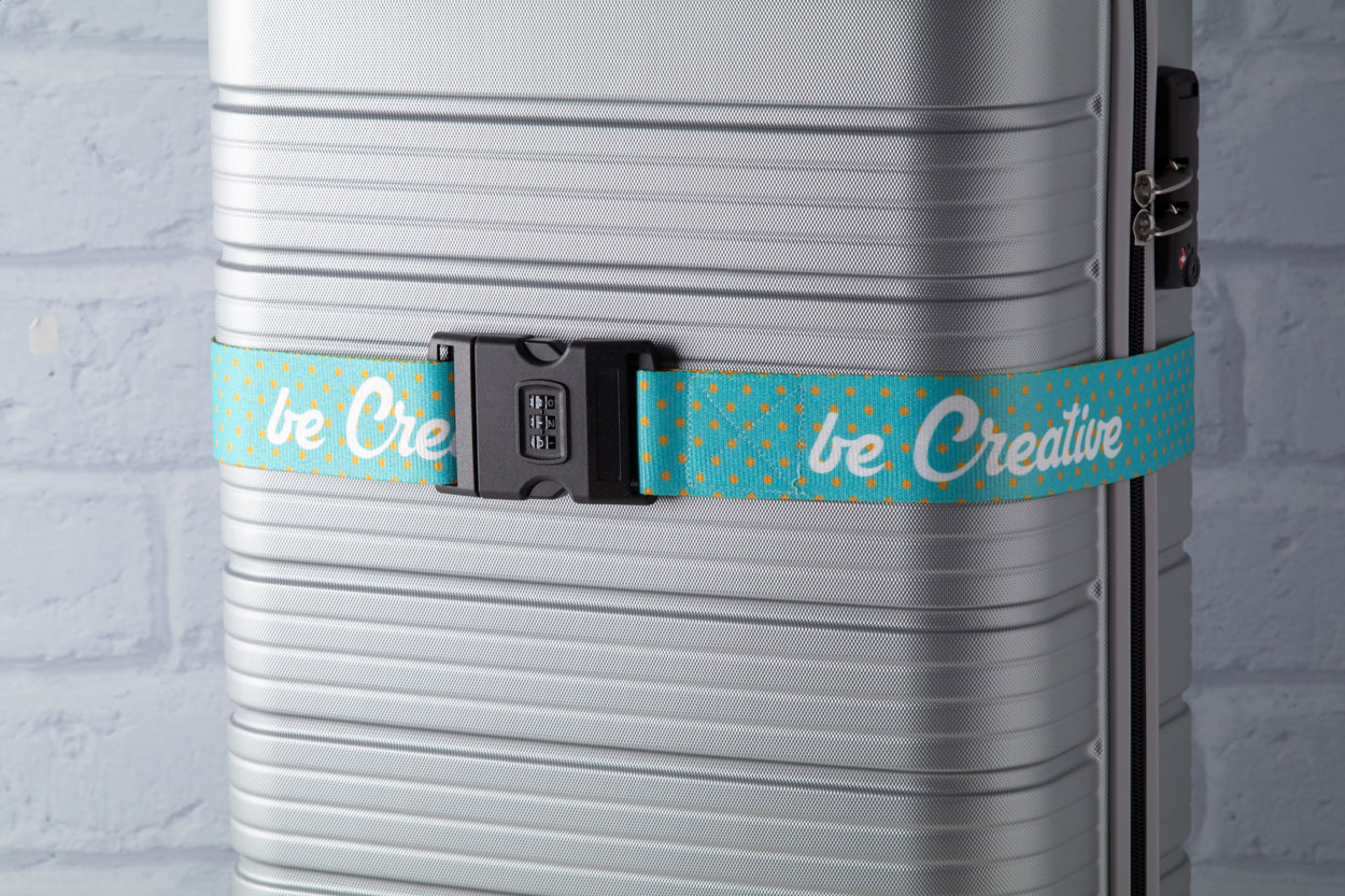 Custom made, polyester luggage belt with adjustable strap and 3-digit combination lock. With sublimation printed graphics on both sides. MOQ: 50 pcs.