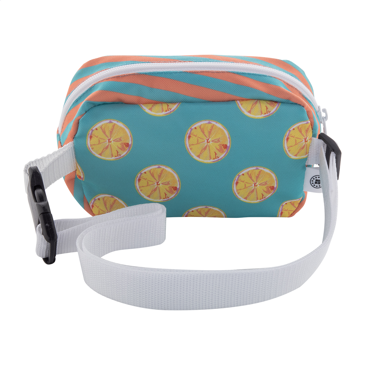 Custom made waist bag with zipped compartment and front pocket, 600D RPET polyester. With all over sublimation printed graphic sand distinctive RPET label. MOQ: 25 pcs.