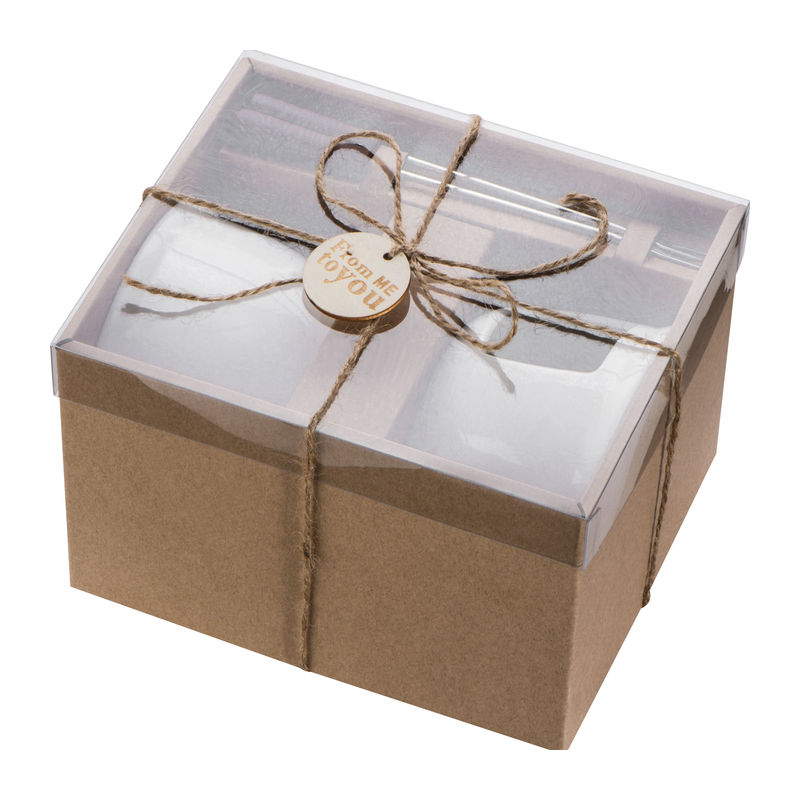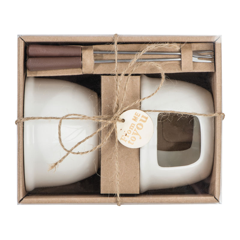 Chocolate fondue set made of porcelain, including 2 fondue forks. Dip fruits or biscuits into the chocolate and enjoy this beautiful gift set. Your logo will be printed on a label and sticked on the single box.