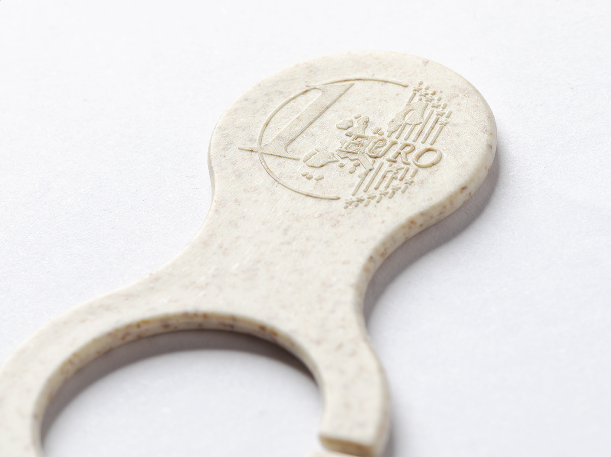 Ecological wheat straw and ABS plastic shopping trolley coin, with euro sign on one side. Only one side printable.