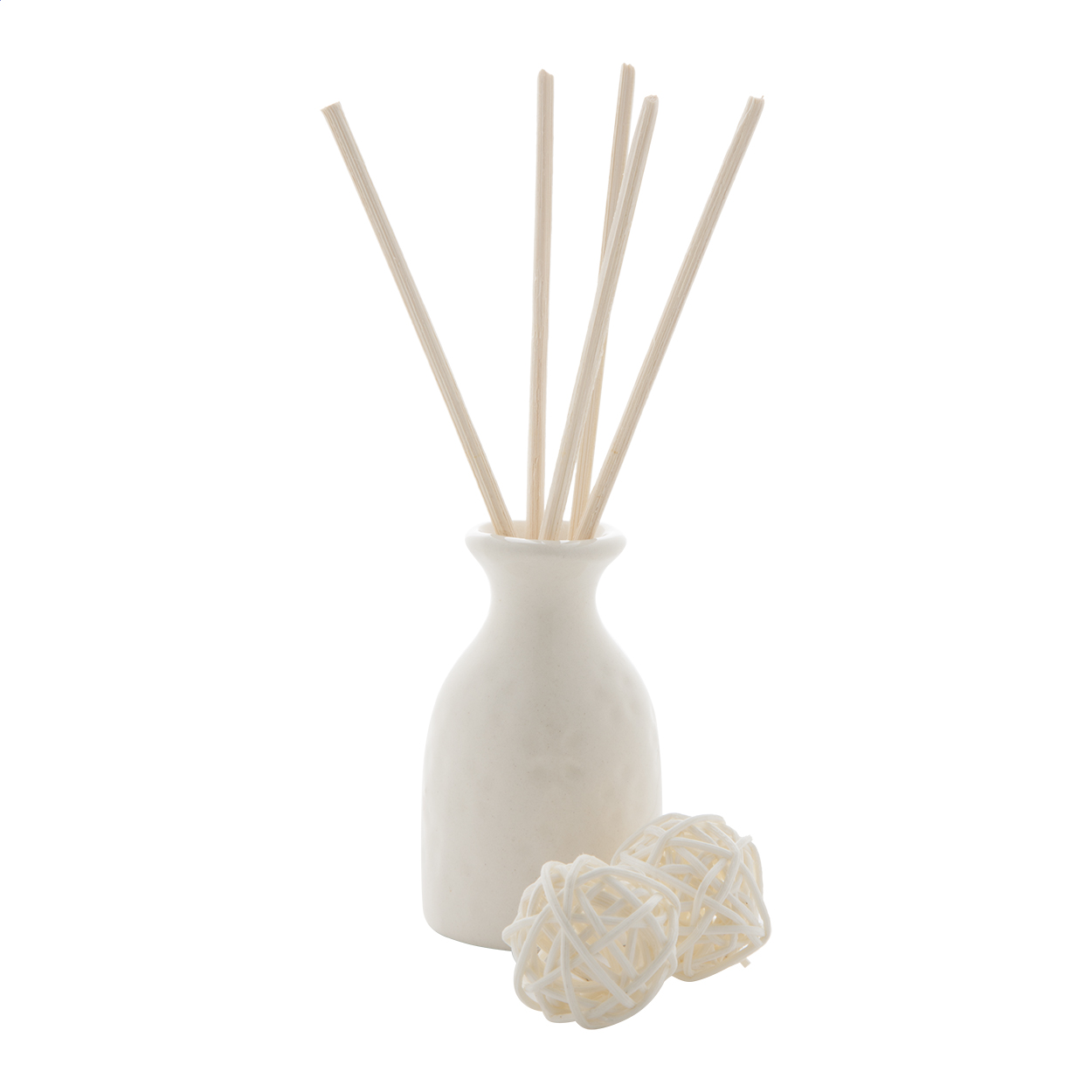 Aroma diffuser set with jasmine oil, mini ceramic vase, 5 wooden diffuser sticks and 2 wooden balls. In white gift box.