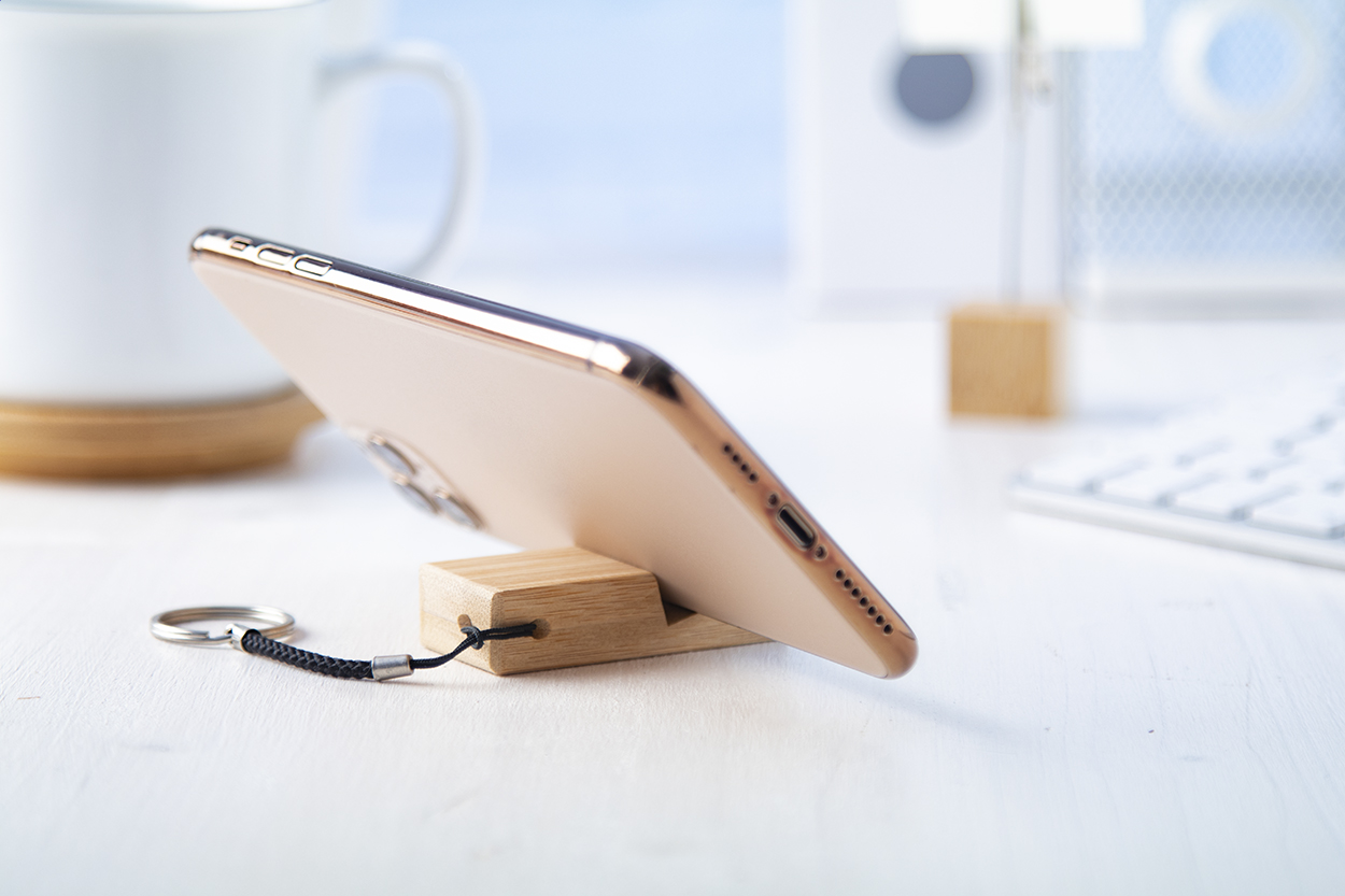 Mobile holder keyring in bamboo with metal ring.