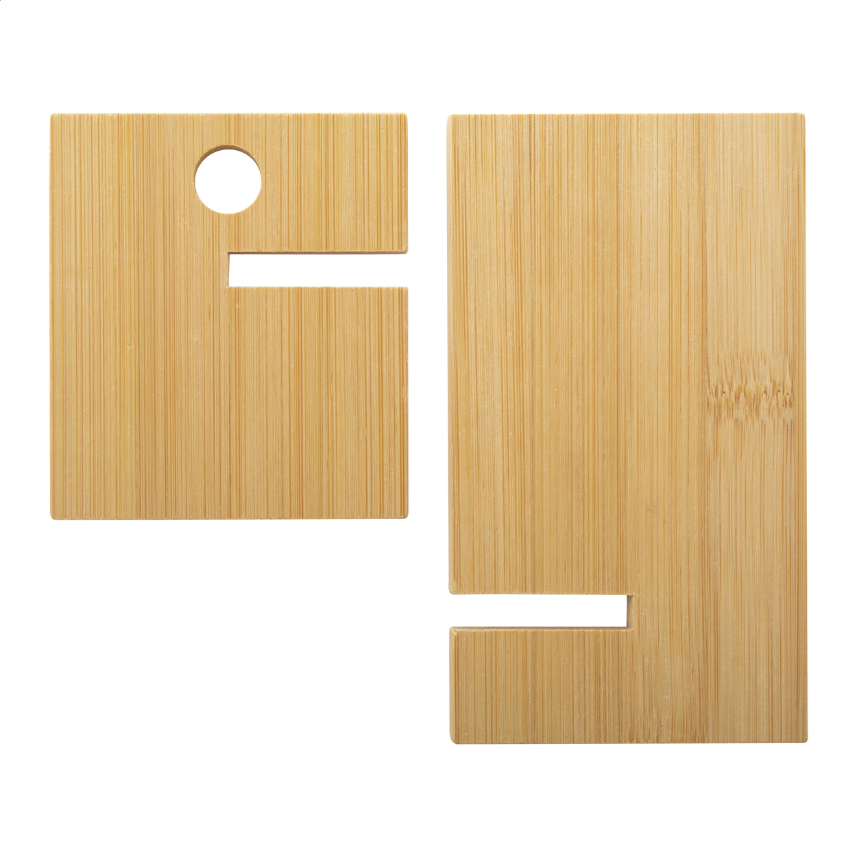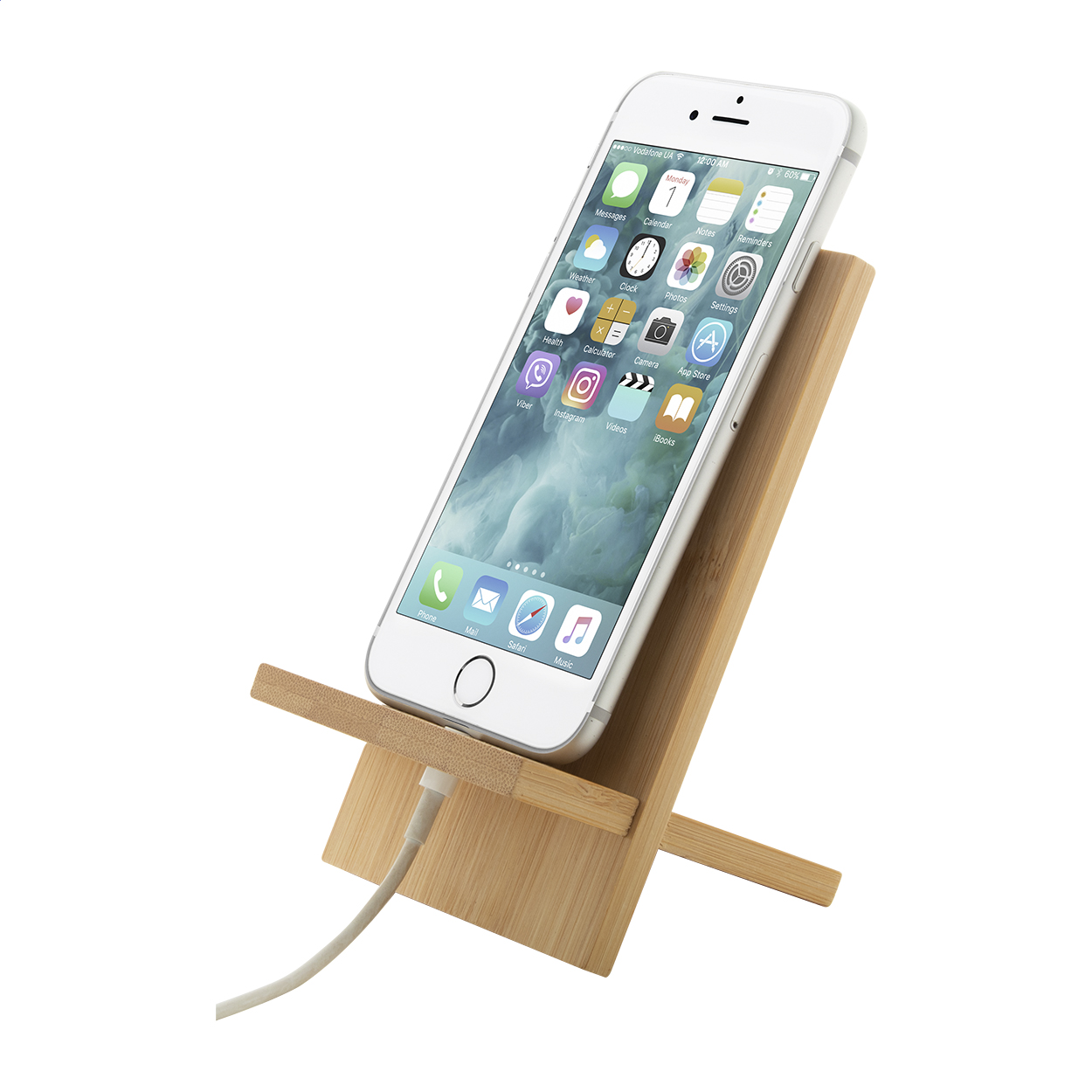 Desk mobile phone holder in bamboo. With cable routing hole for convenient charging. Delivered flat-packed.
