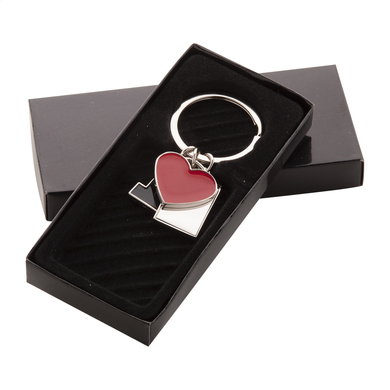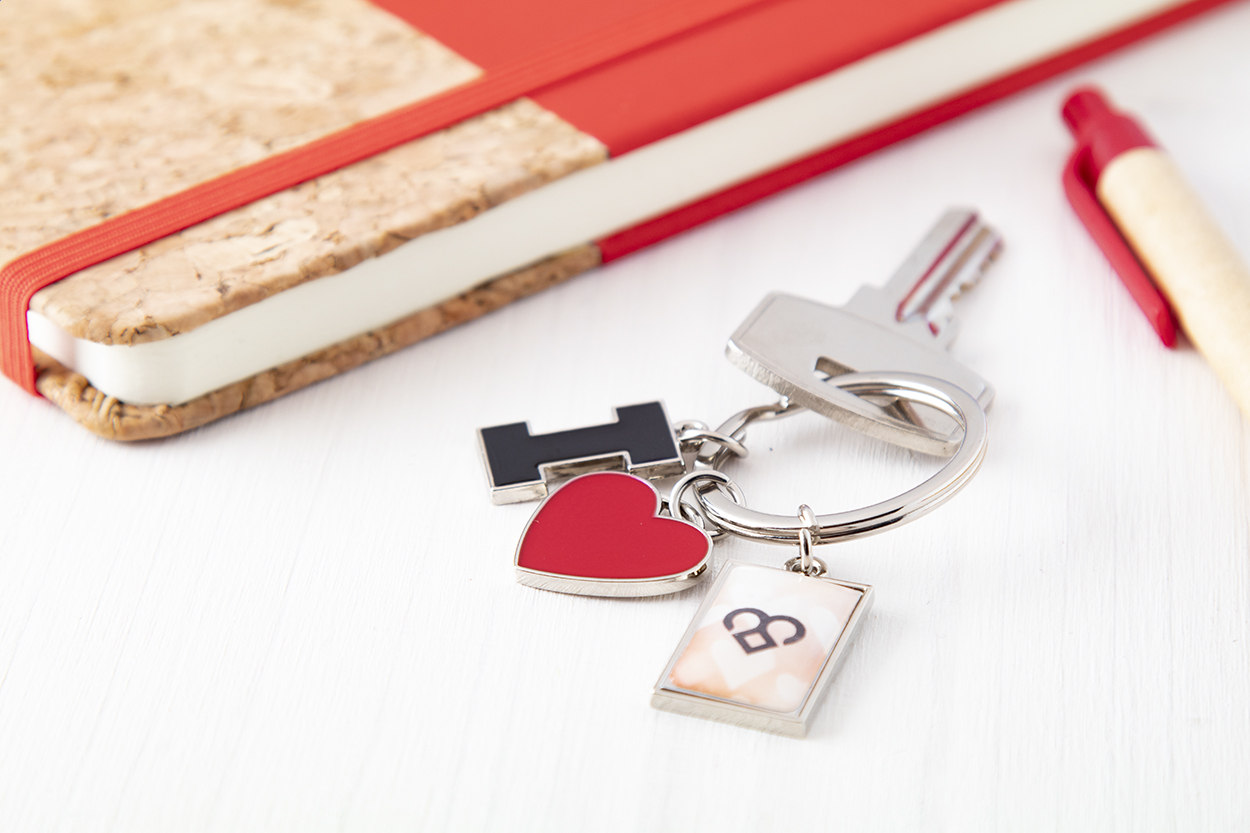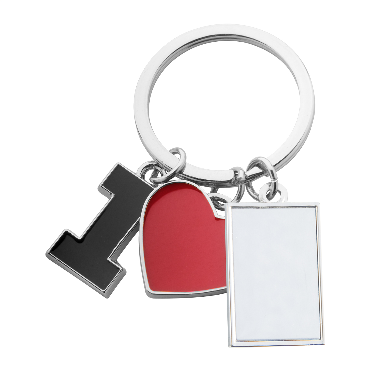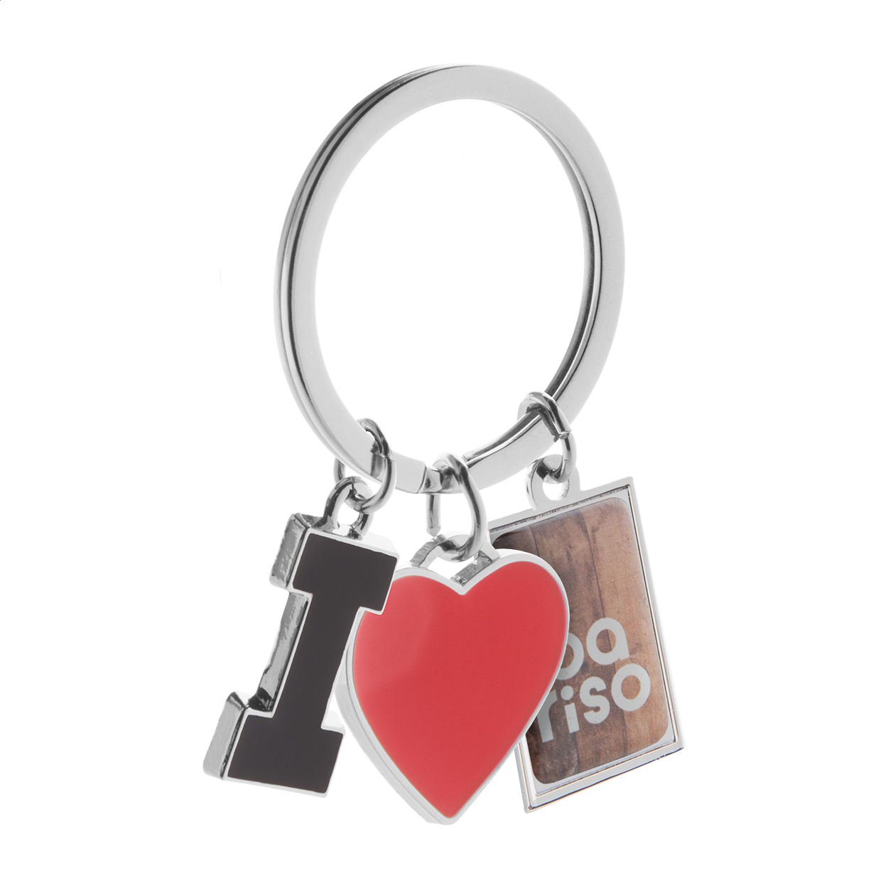 Metal keyring with 3 charms: "I", heart and a rectangle. In black gift box.