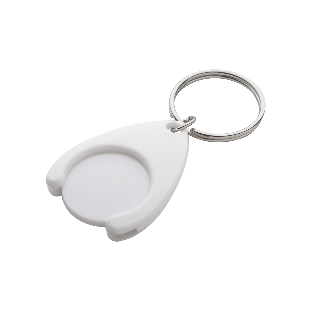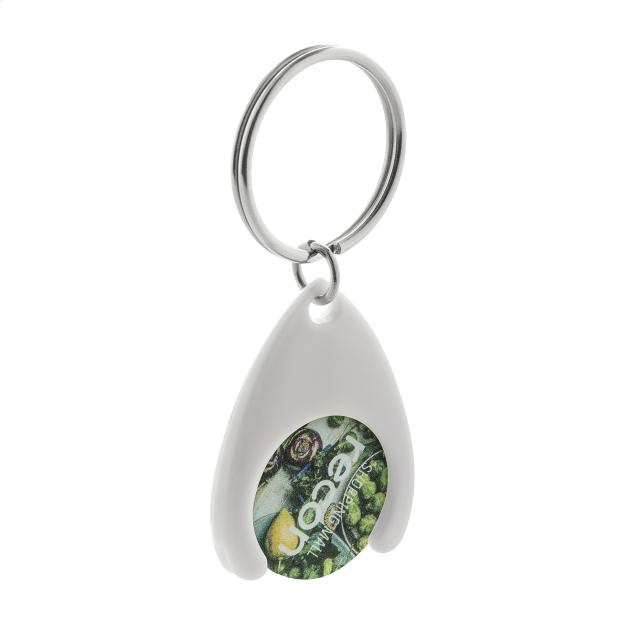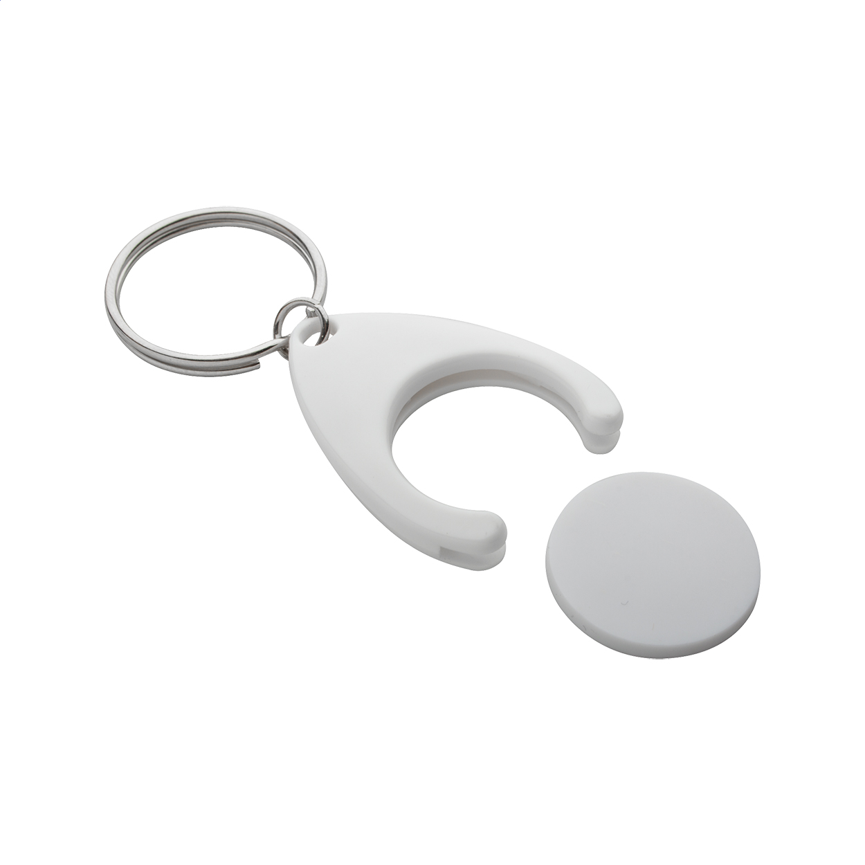 Plastic keyring with shopping trolley coin and metal ring. Coin size: ø24×2 mm.
