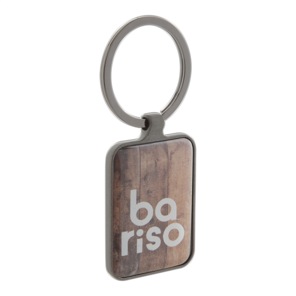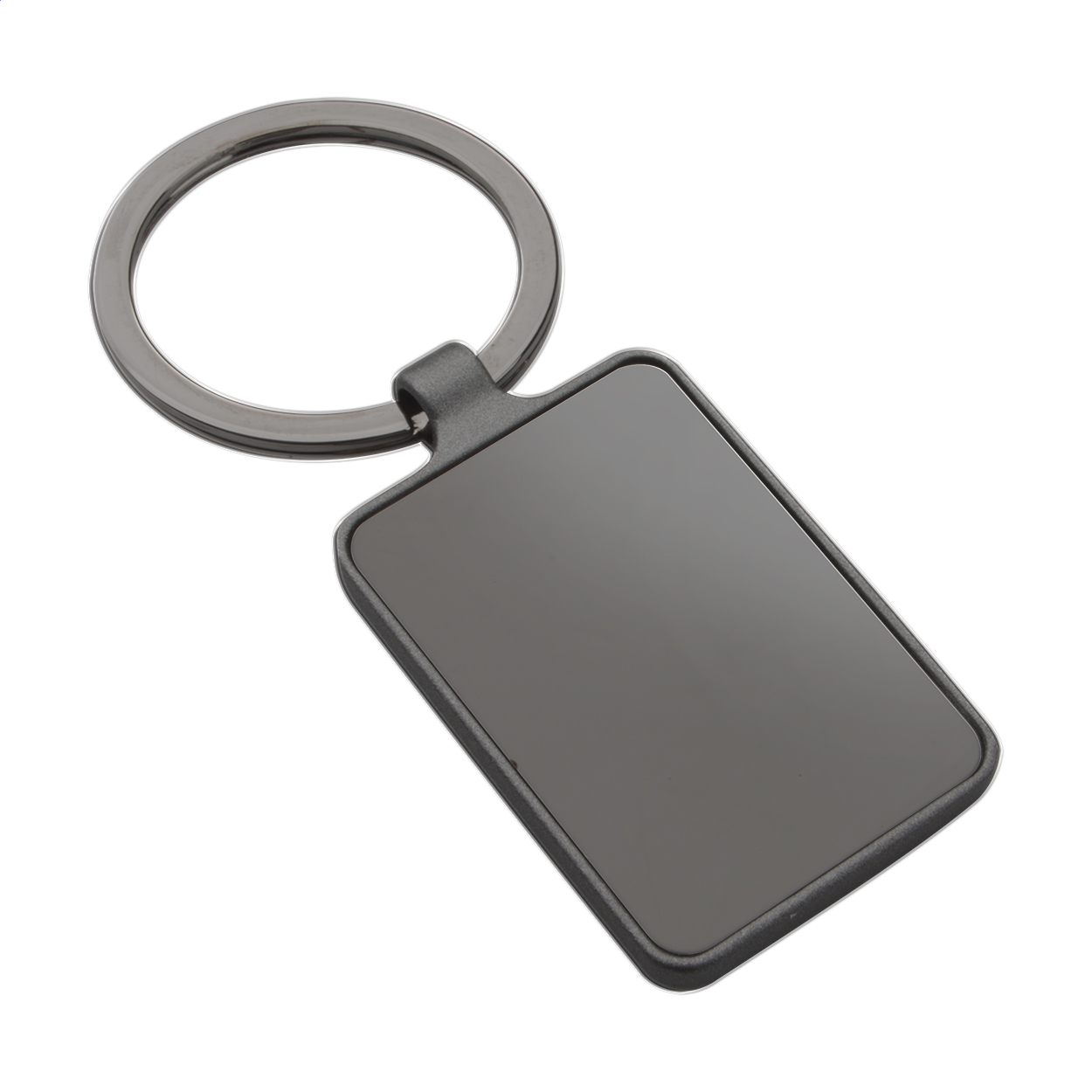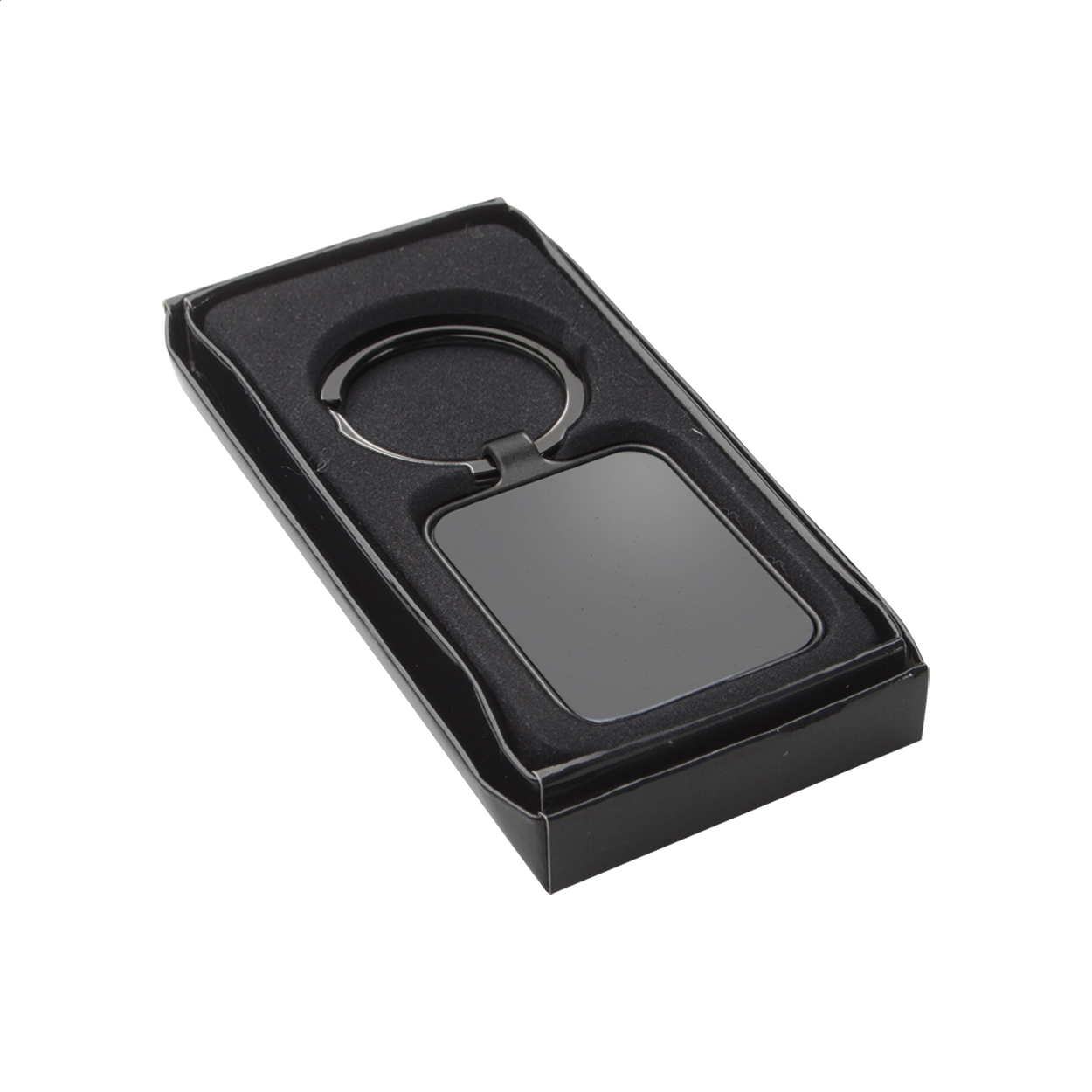 Rectangular shaped metal keyring with gunmetal finish and shiny plates on both sides. In black gift box.