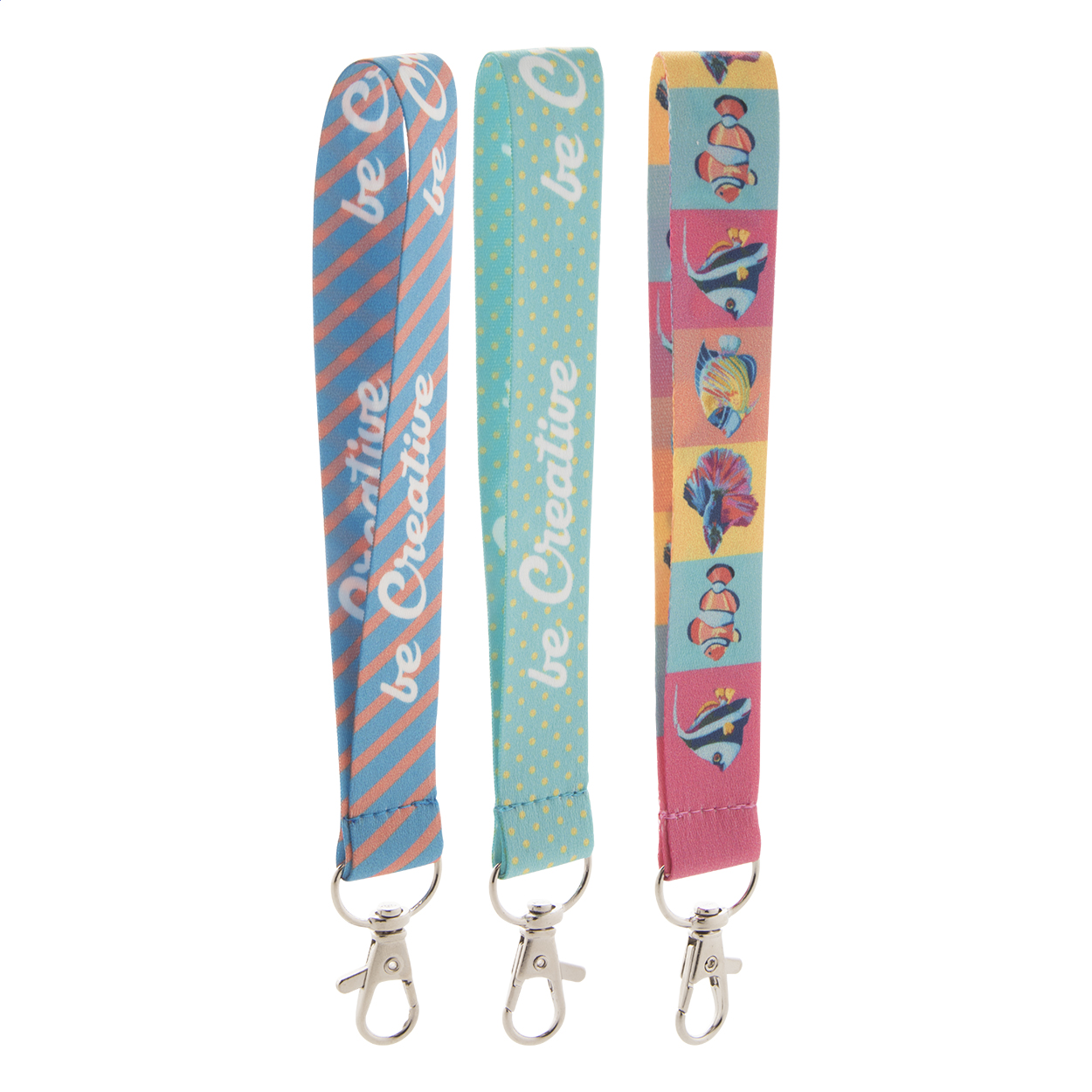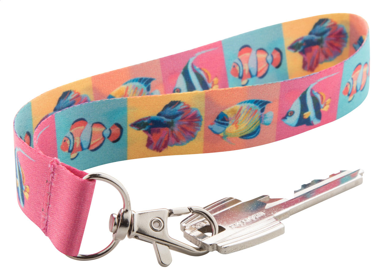 Custom made, polyester keyring with metal carabiner. With sublimation printed graphics on both sides. MOQ: 100 pcs.