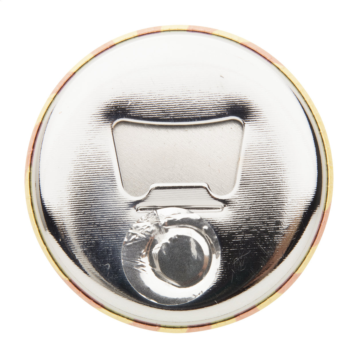 Pin button bottle opener and fridge magnet with custom full colour paper insert. Price includes digital printing. MOQ: 100 pcs.