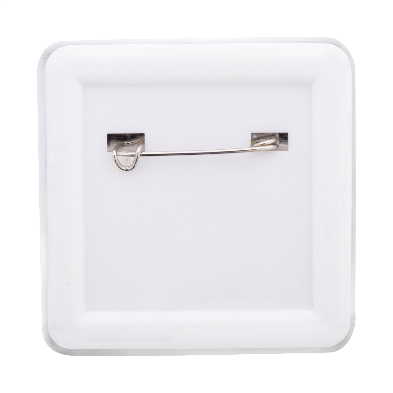 Square shaped pin button badge with custom full colour paper insert. Price includes digital printing. MOQ: 100 pcs.
