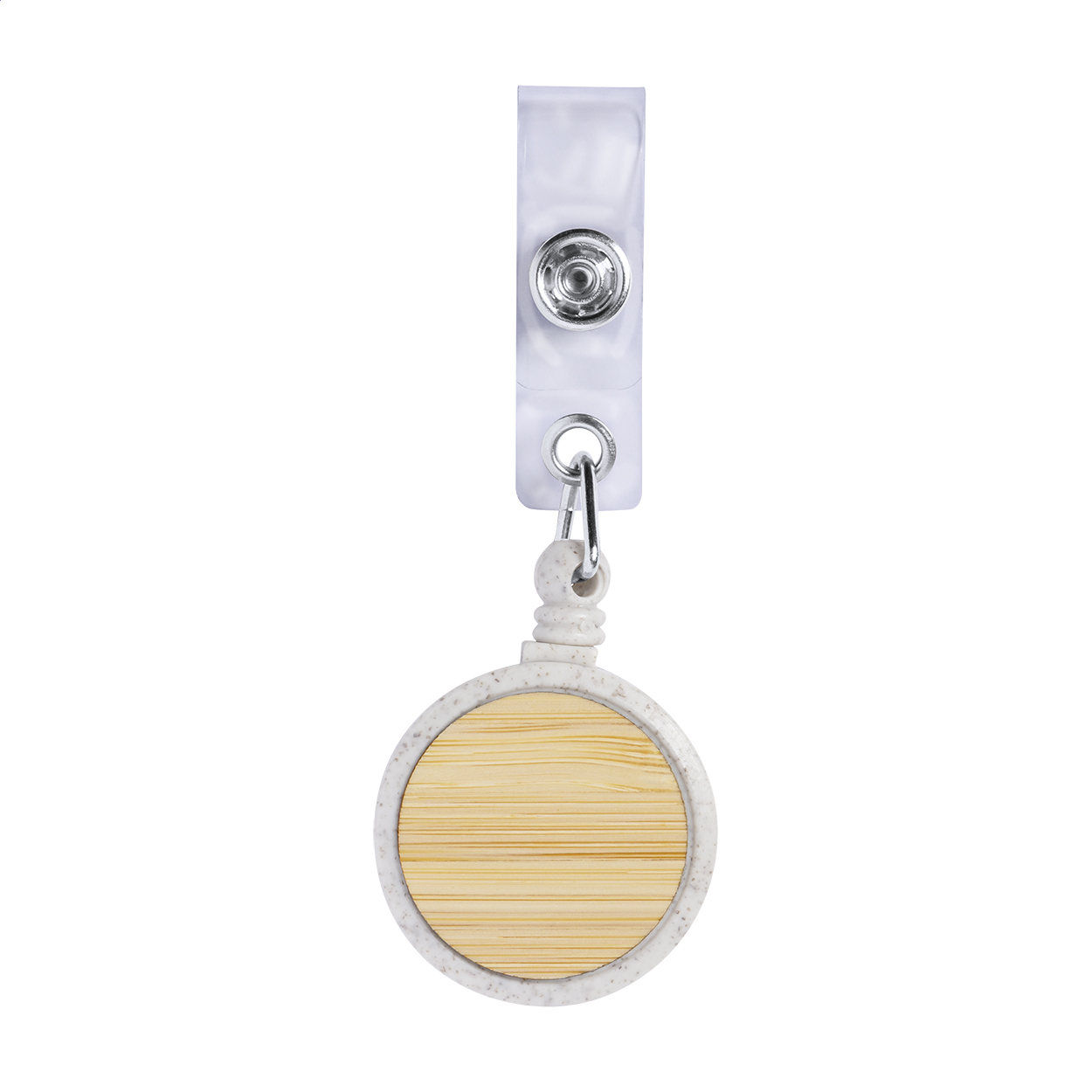 Ecological wheat straw plastic and bamboo badge holder with press-stud closure, telescopic line and metal clip.