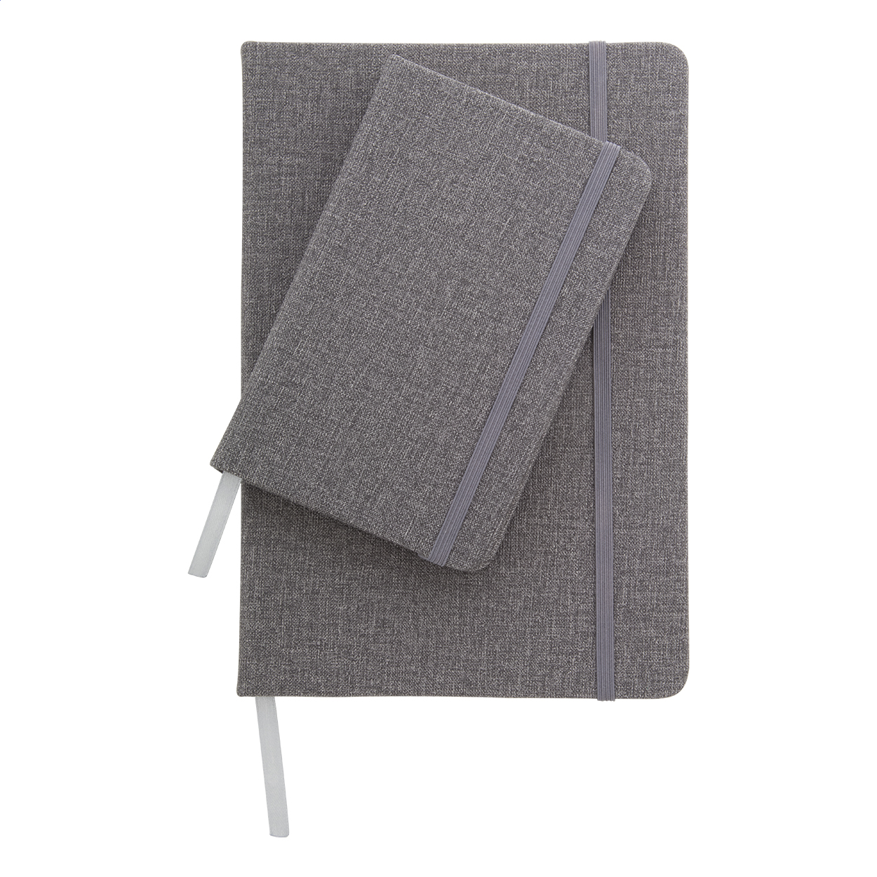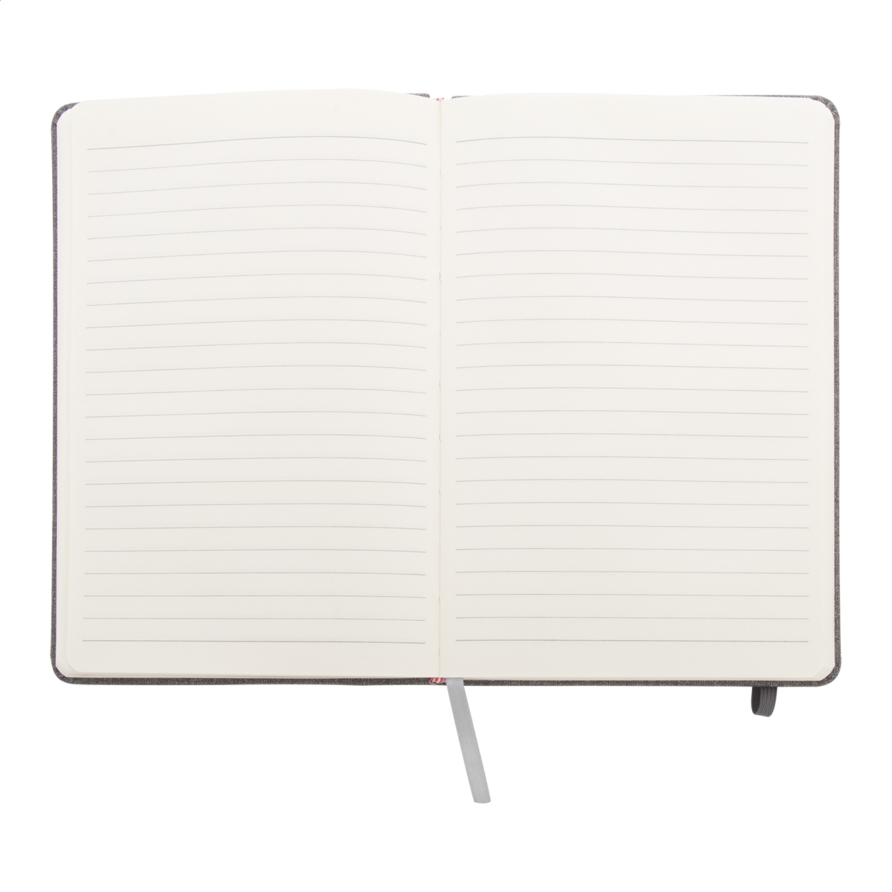 Textured PU leather covered notebook with rubber strap and 80 lined sheets. A5 size.