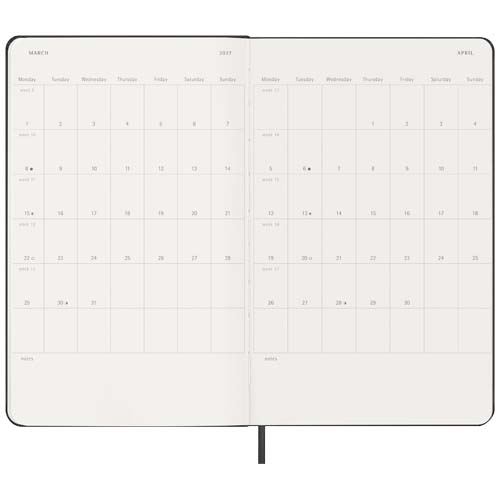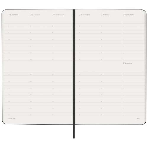 The hard cover Moleskine L weekly planner Vertical is dated from January to December 2027. Formatted in a vertical format to show each week on a two page spread with the days spanning the top of the page, this popular planner style is perfect for those who want to have an overview of the organised week. Features ivory-coloured acid-free paper, a black elastic closure, a page ribbon marker, a colour coordinated expandable inner pocket, and stickers for personal customisation, as well as year stickers for the spine.