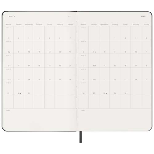 Dated from January to December 2027, the Moleskine hard cover 12-month weekly planner shows the whole week at a glance, while also providing yearly and monthly snapshot pages for a broader overview of the year, followed by pages for travel planning, ideas and goals. The days of the week are displayed across two pages. Features ivory-coloured acid-free paper, a black elastic closure, a page ribbon marker, a colour coordinated expandable inner pocket, and stickers for personal customisation, as well as year stickers for the spine.