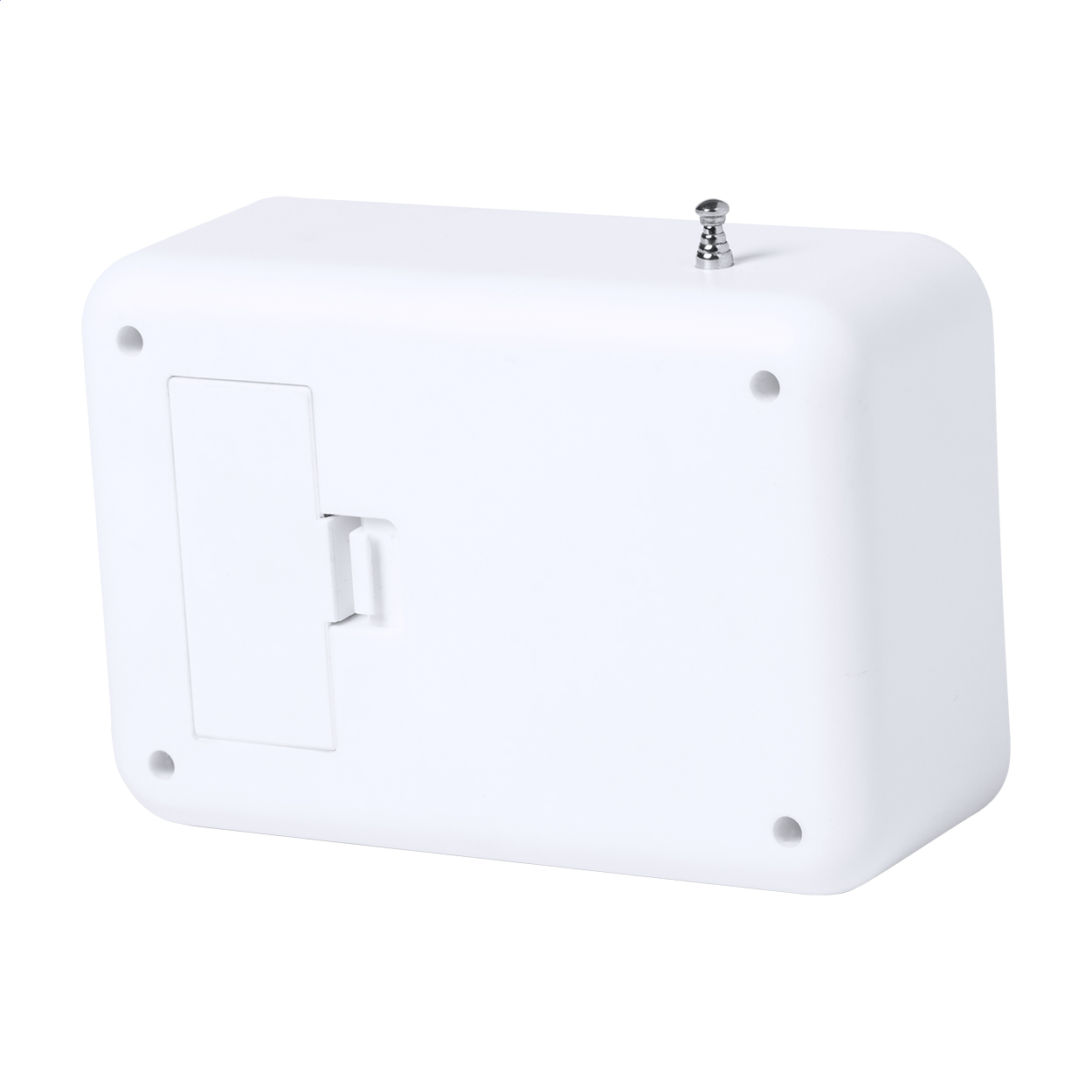 Bamboo desk clock with FM radio, thermometer, calendar and alarm functions. Operates with 2 AAA batteries, without batteries.