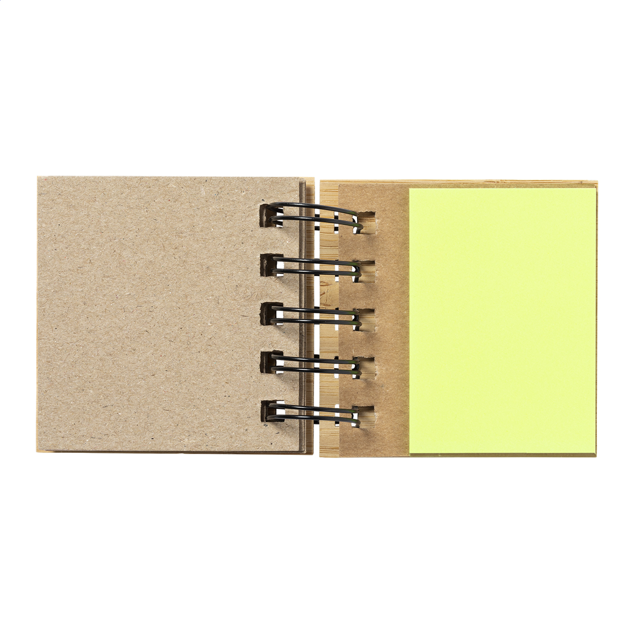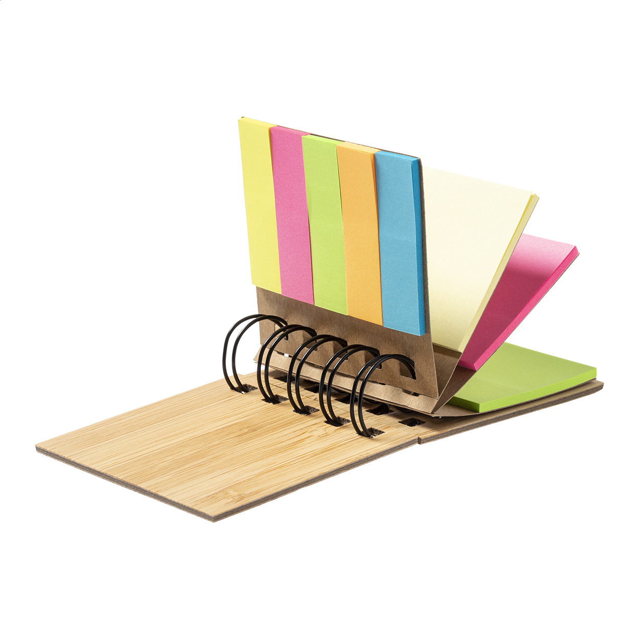 Bamboo covered, spiral notepad with 75 large sticky notes (in 3 different colours) and 125 page markers (in 5 different colours).