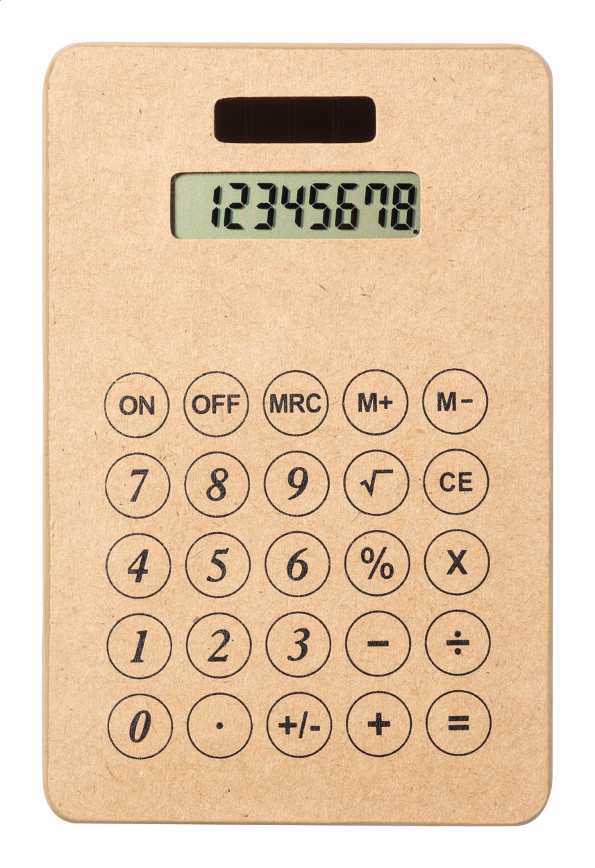 8-digit solar powered calculator in recycled paper housing. Including button cell battery.
