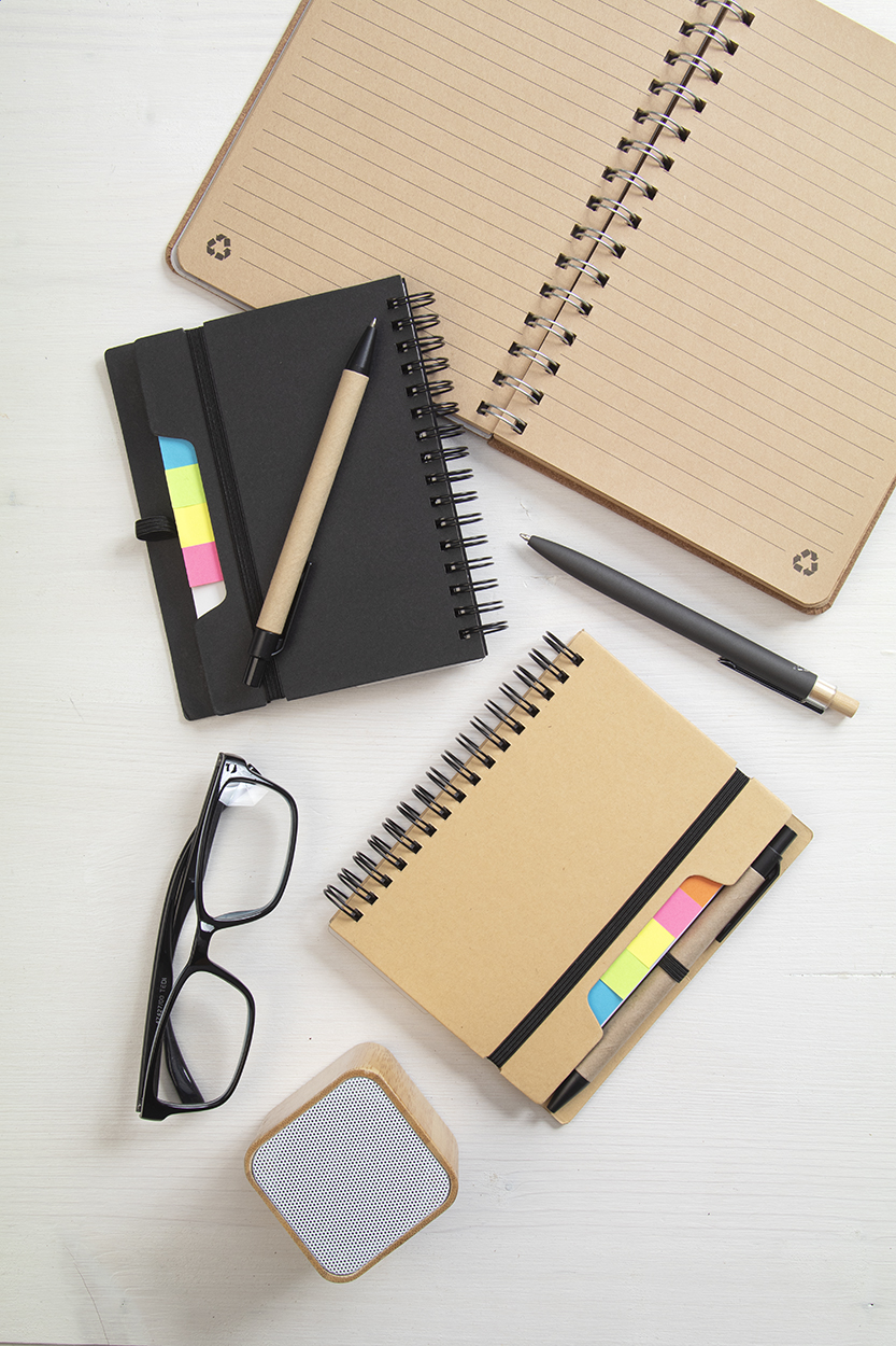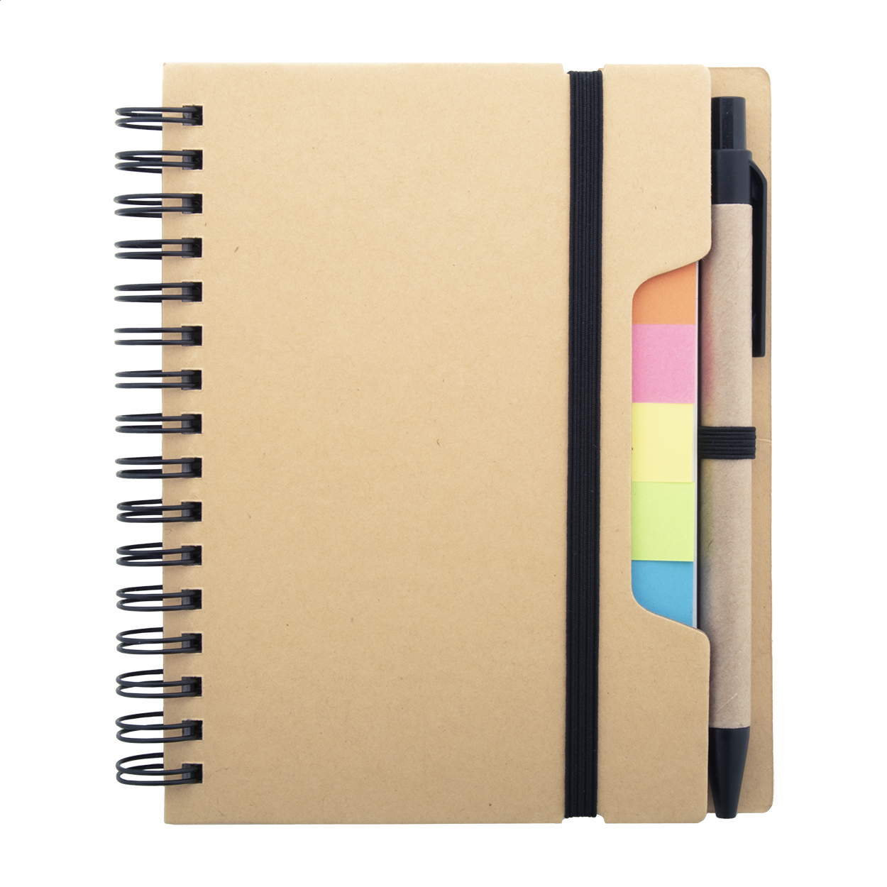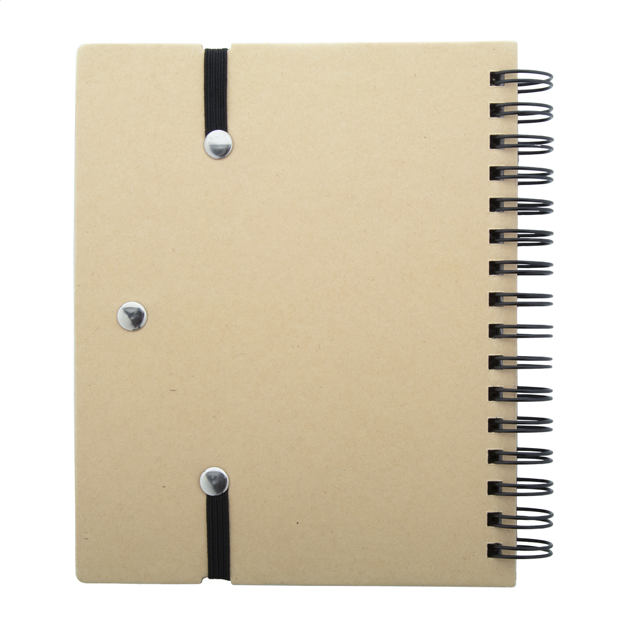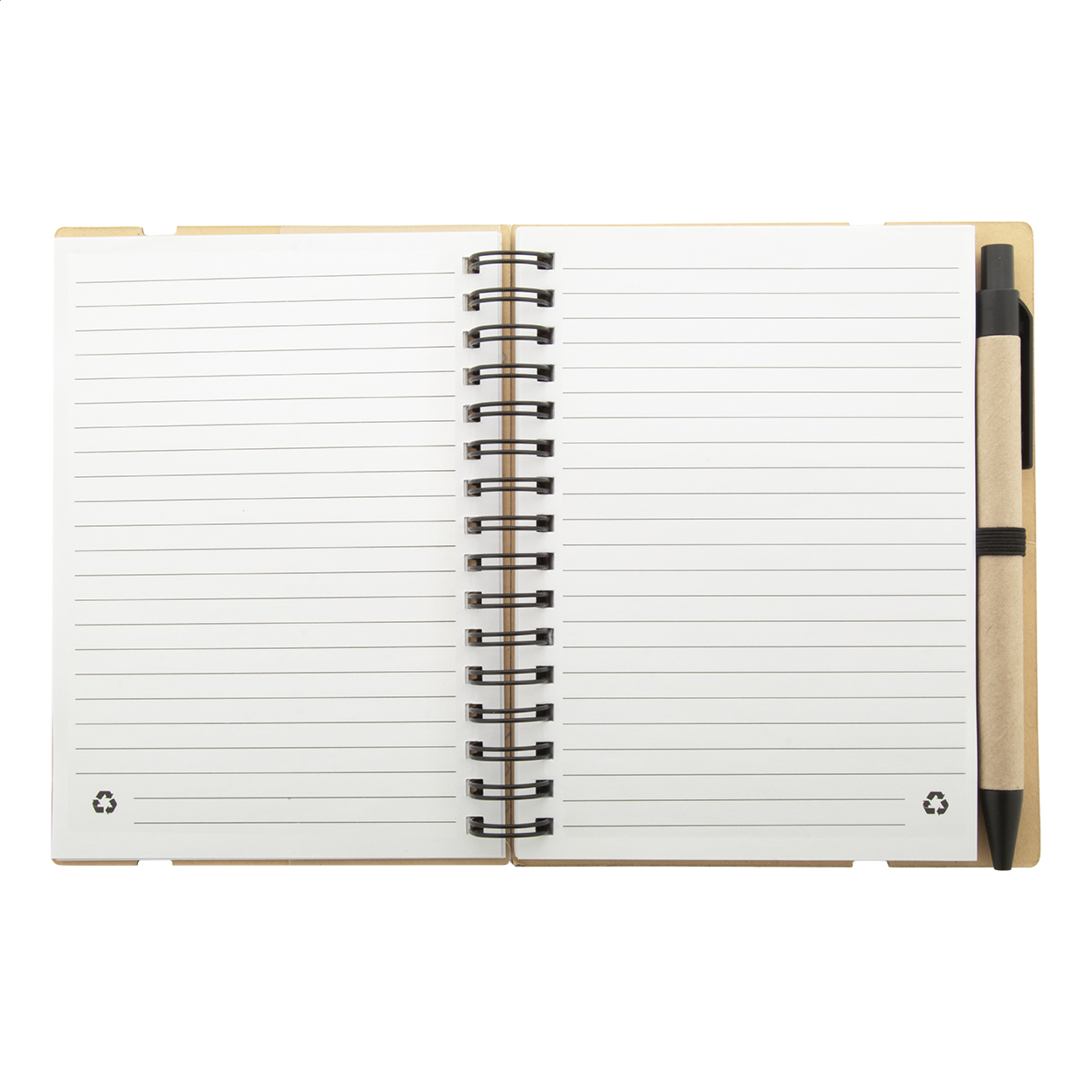 Recycled paper spiral notebook with 70 lined sheets and 125 page markers (in 5 different colours). With rubber strap and pen holder. A6 size. Including recycled paper ballpoint pen with blue refill.