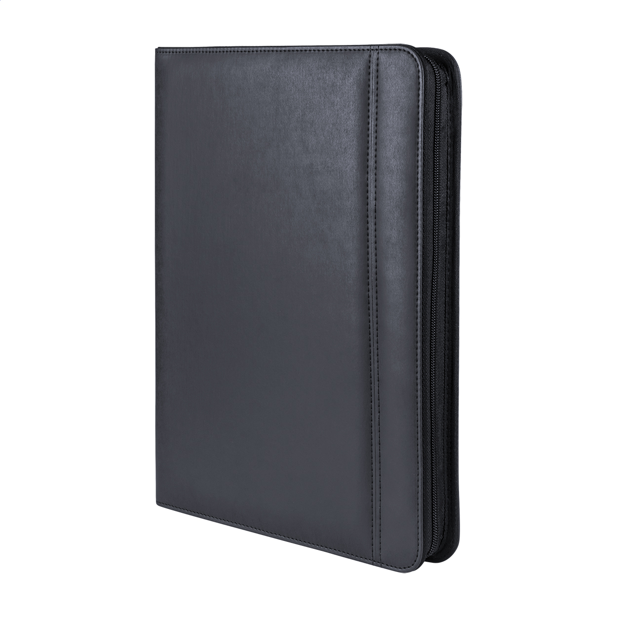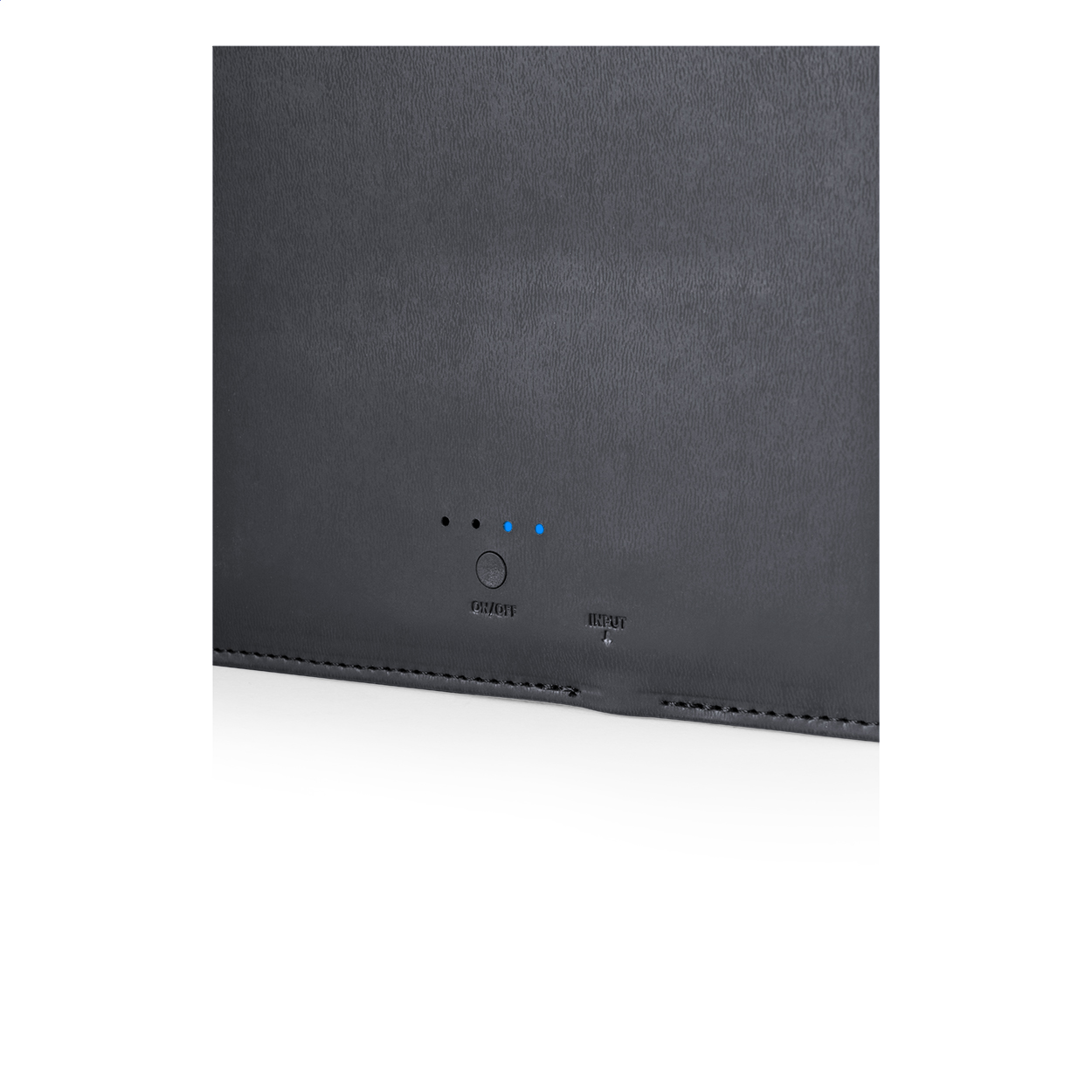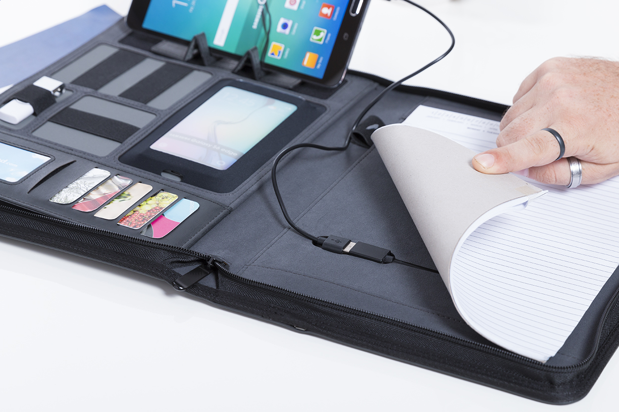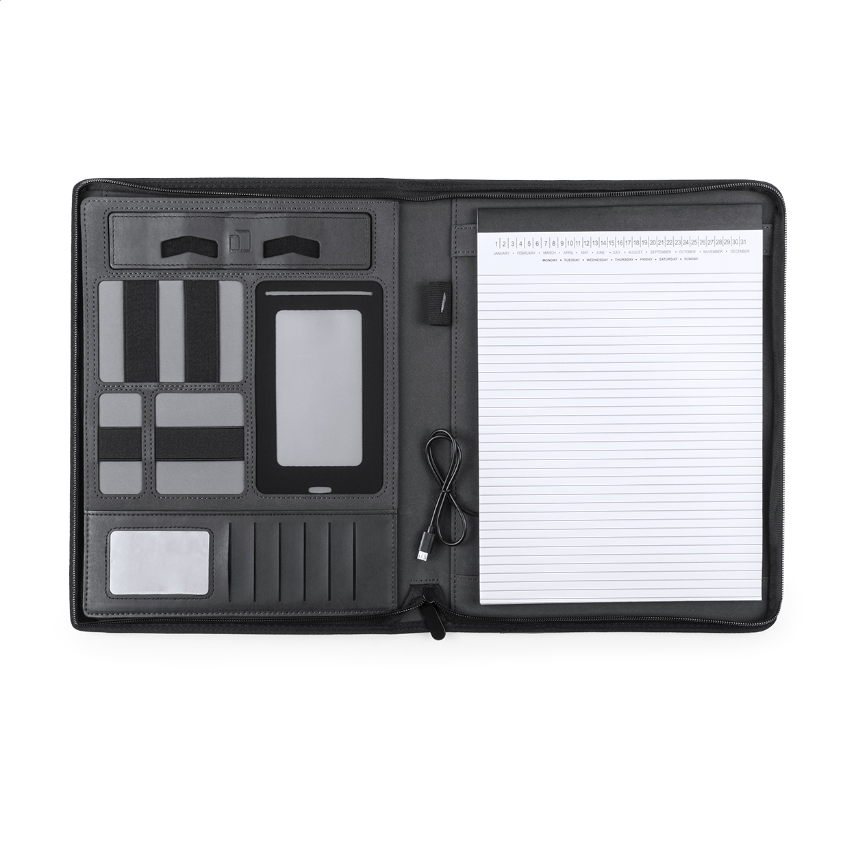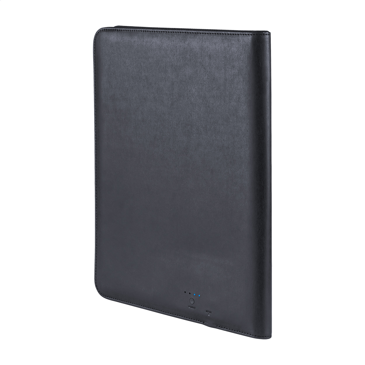 PU leather document folder with 5000 mAh power bank, 20 sheets notepad, mobile and tablet holder. With USB charger cable.