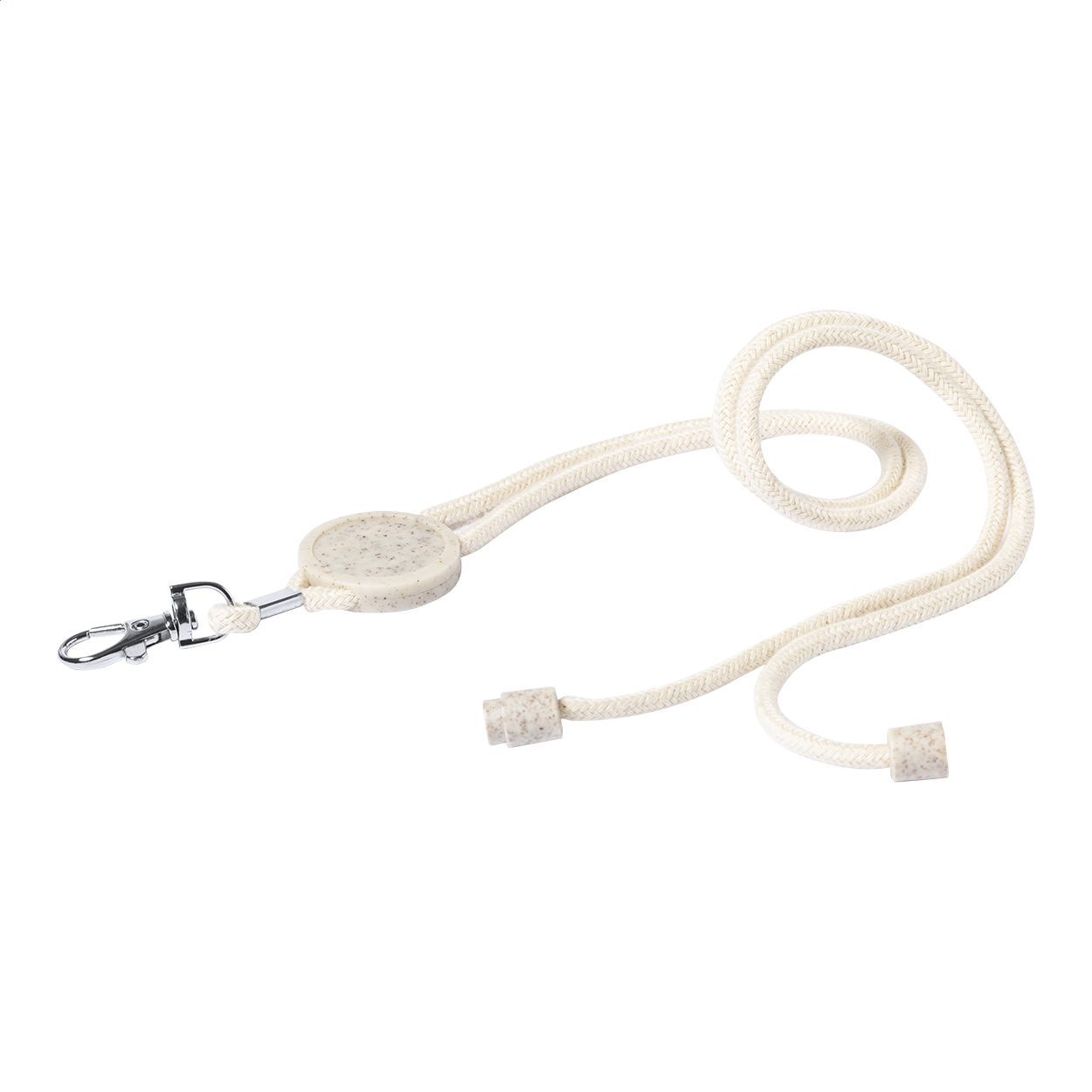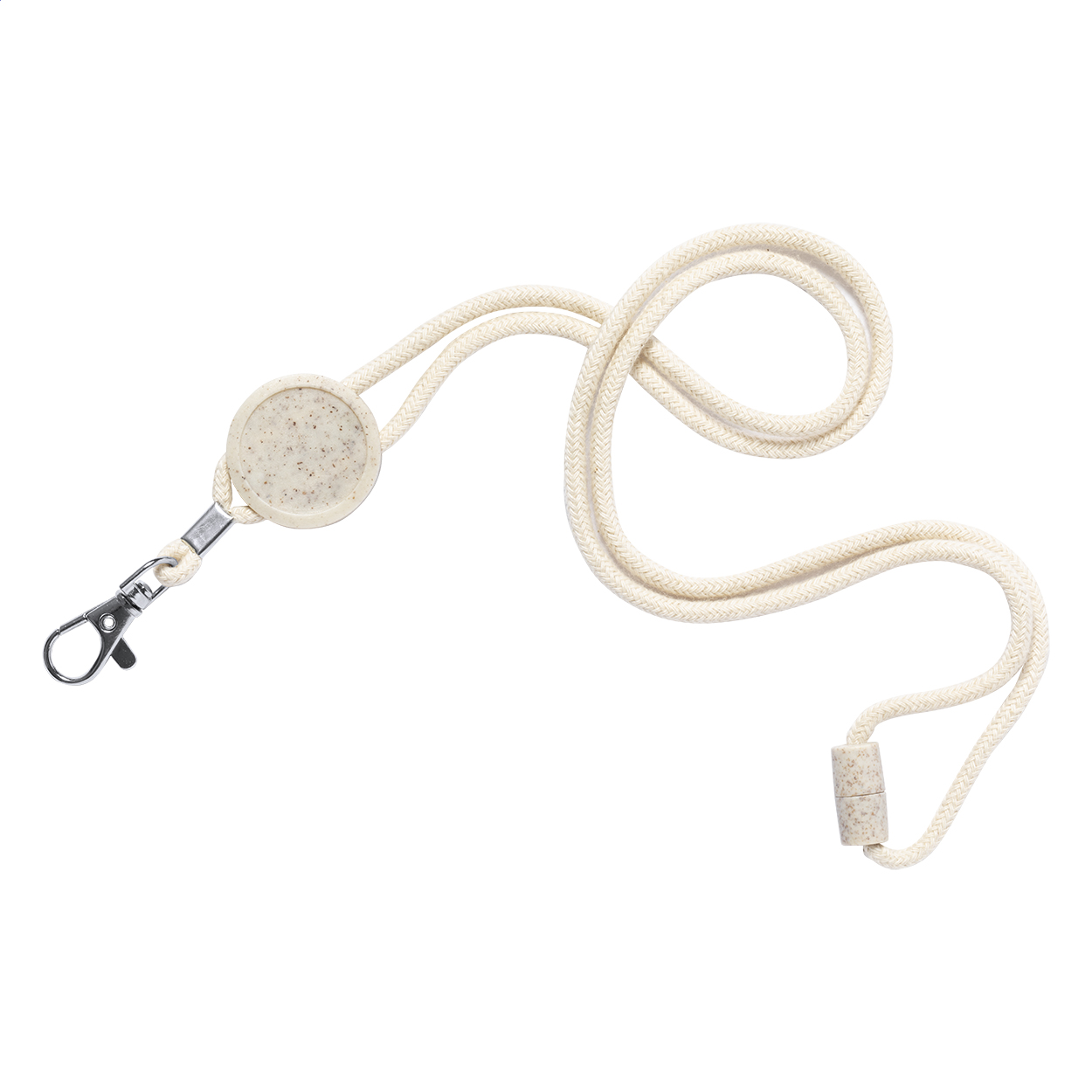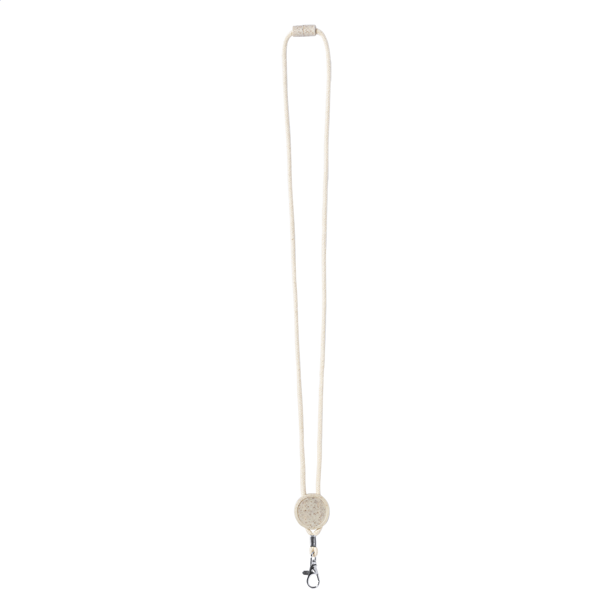 Cotton lanyard with metal carabiner, safety buckle and round tag in ecological wheat straw and ABS plastic. Ideal for epoxy doming.