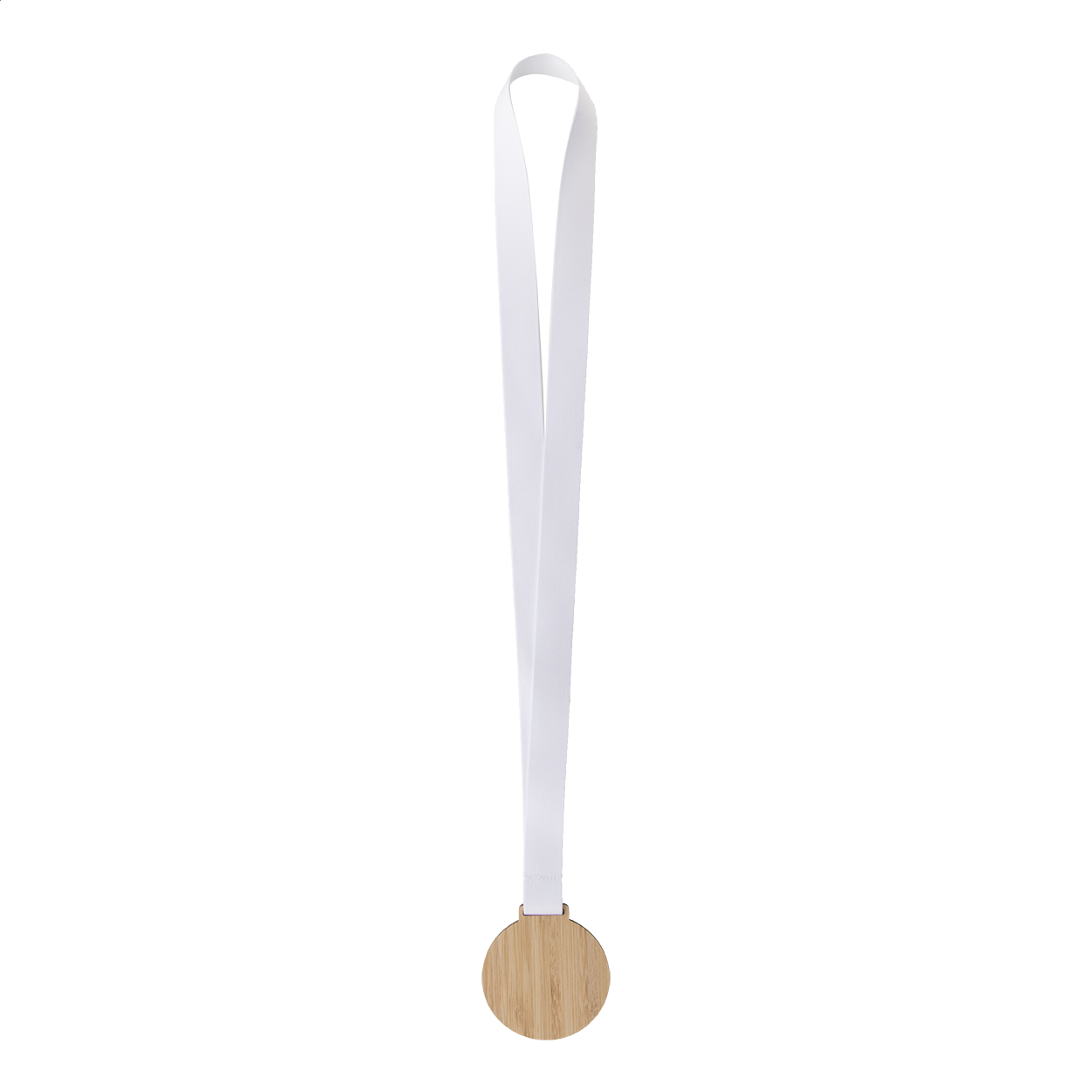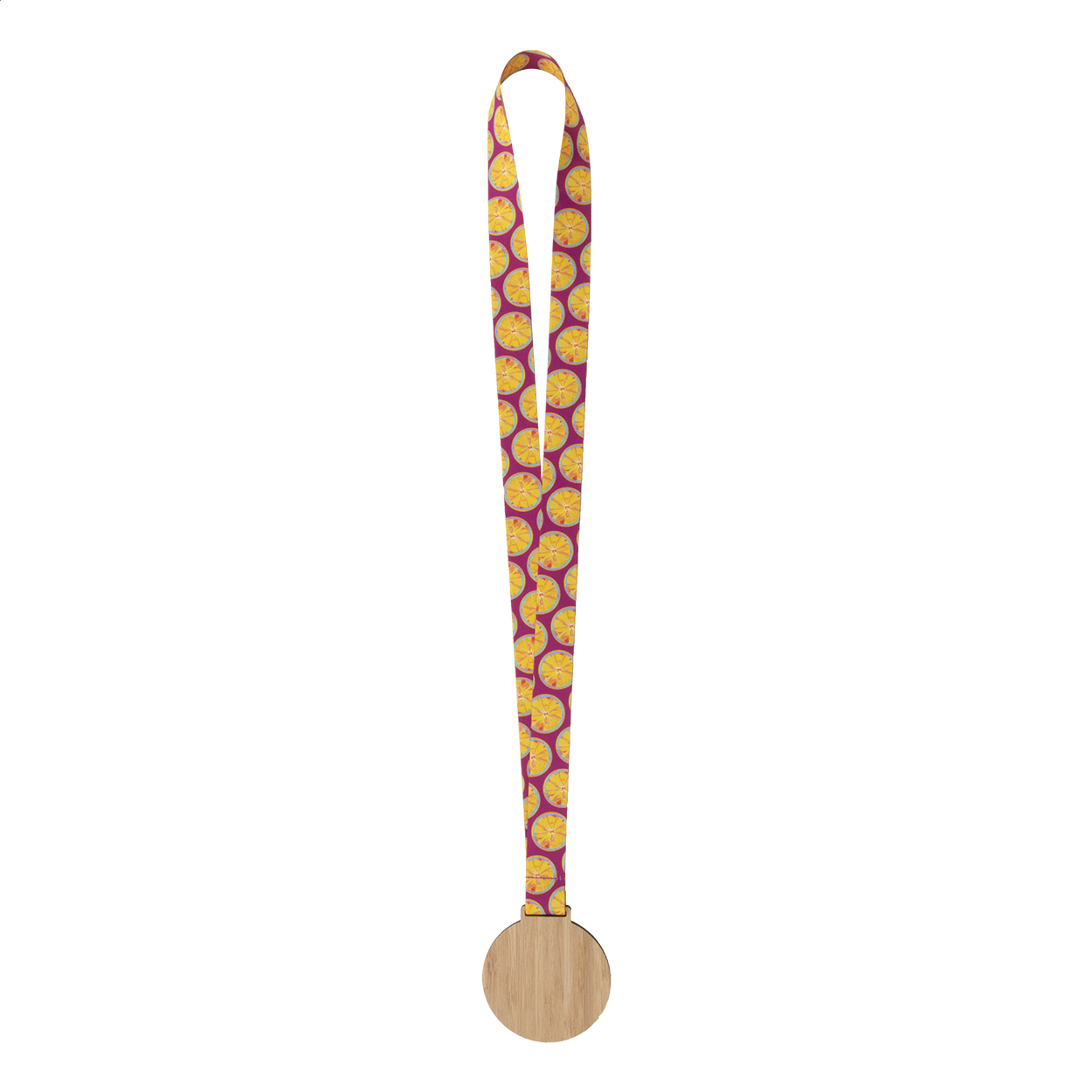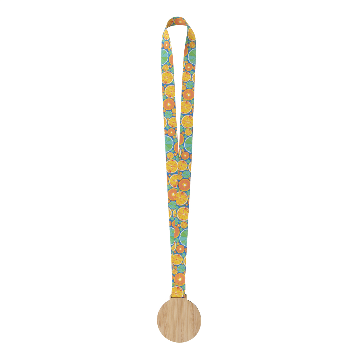 Custom made, bamboo medal on sublimation printed RPET lanyard. Price includes sublimation printing. MOQ: 100 pcs.