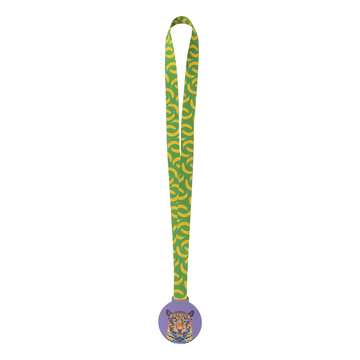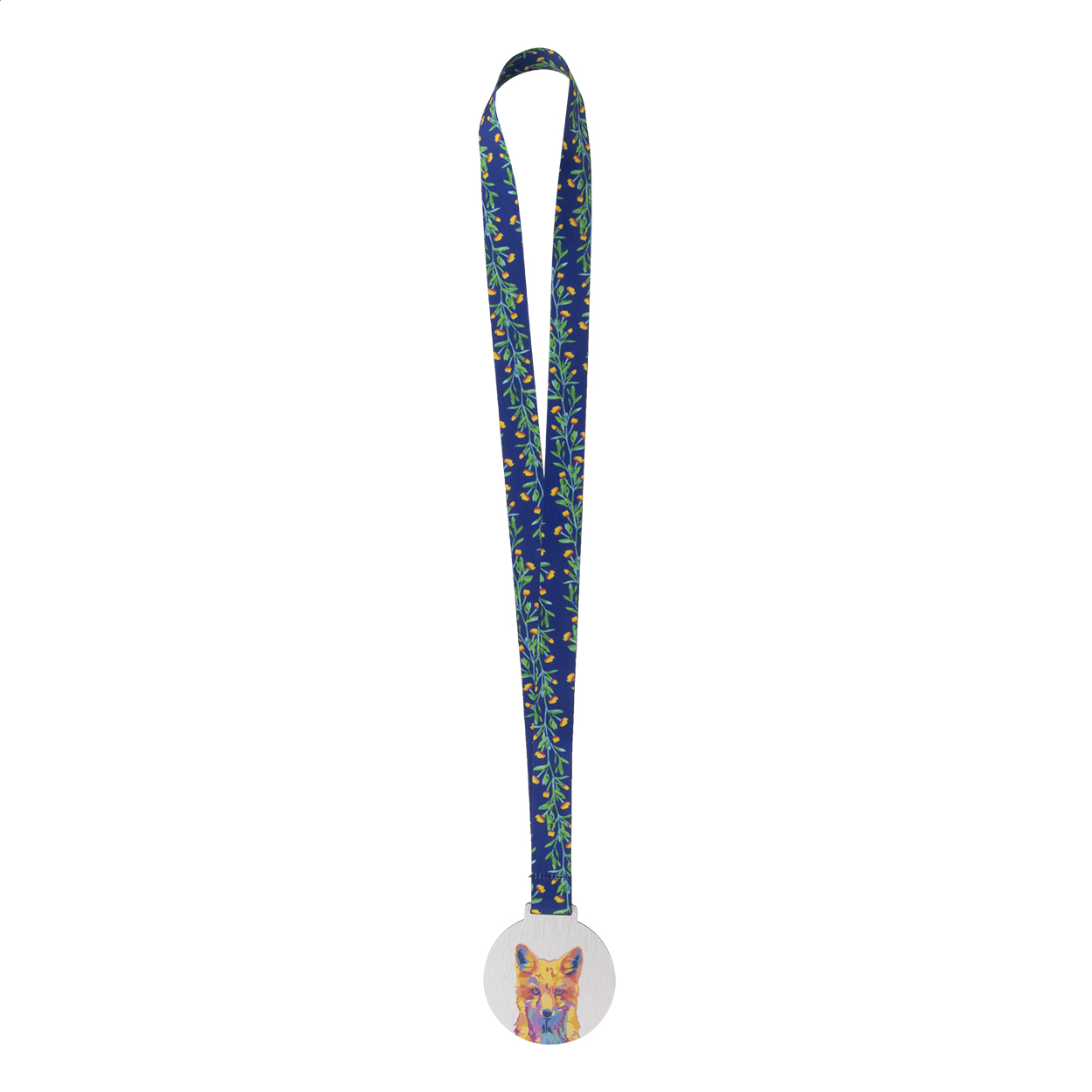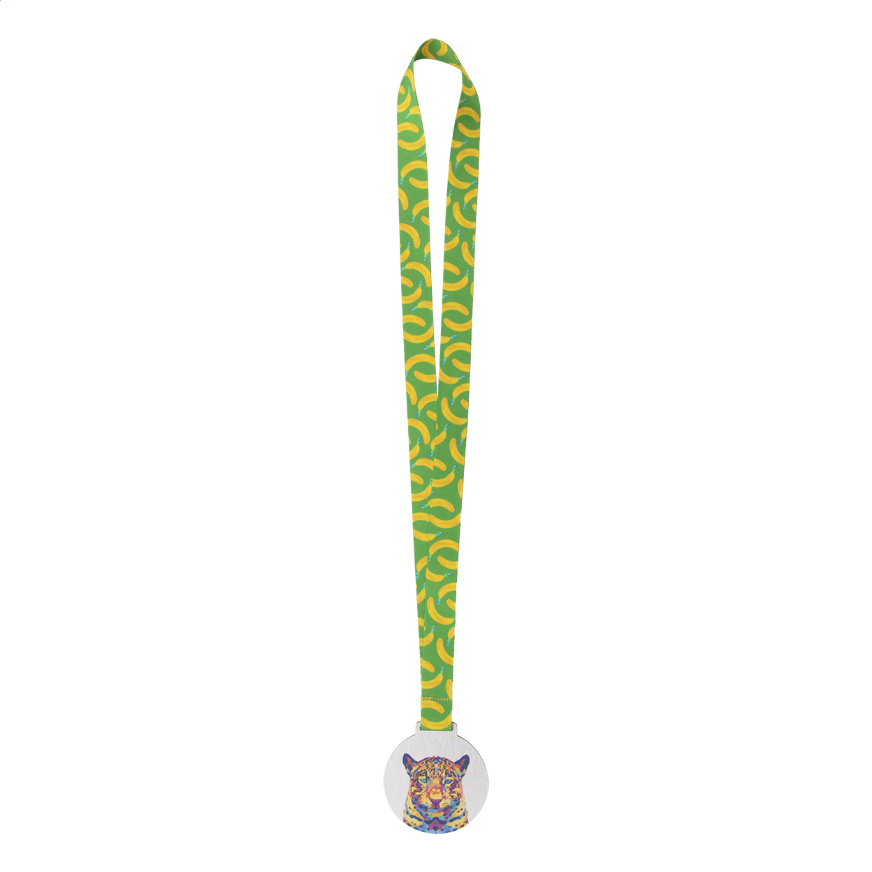 Custom made, brushed aluminium composite medal with full colour graphics. On sublimation printed RPET lanyard. Price includes sublimation and UV LED printing. MOQ: 100 pcs.