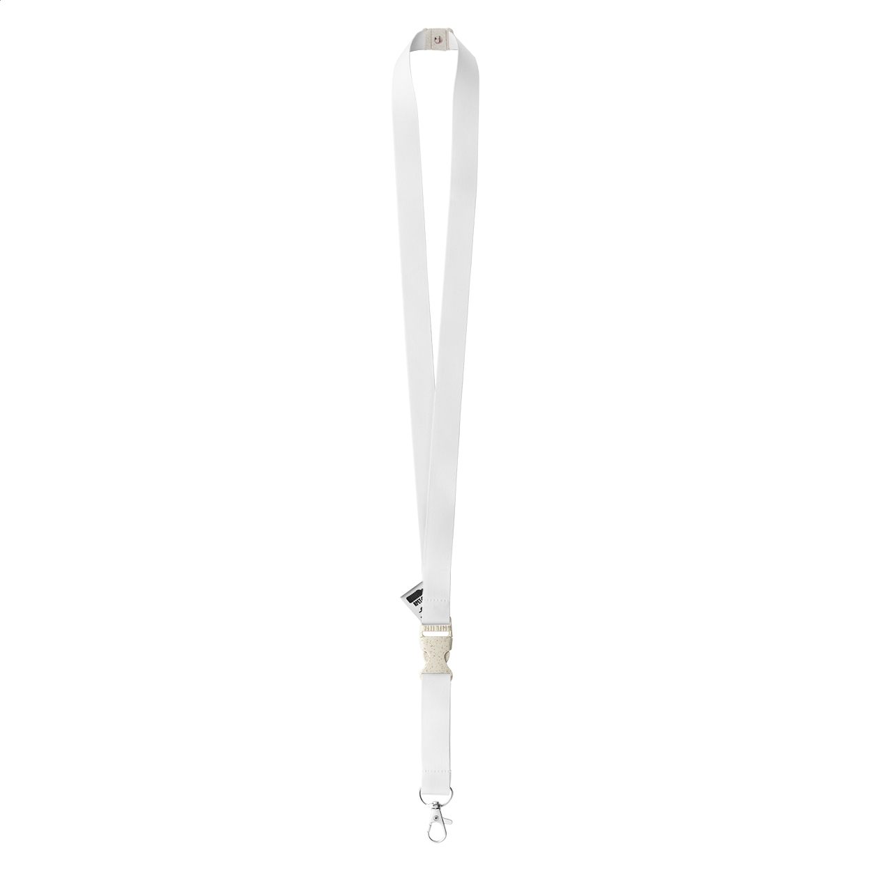 Custom made, RPET lanyard with detachable metal carabiner and wheat straw plastic safety buckle. With sublimation printed graphics on both sides. MOQ: 100 pcs.