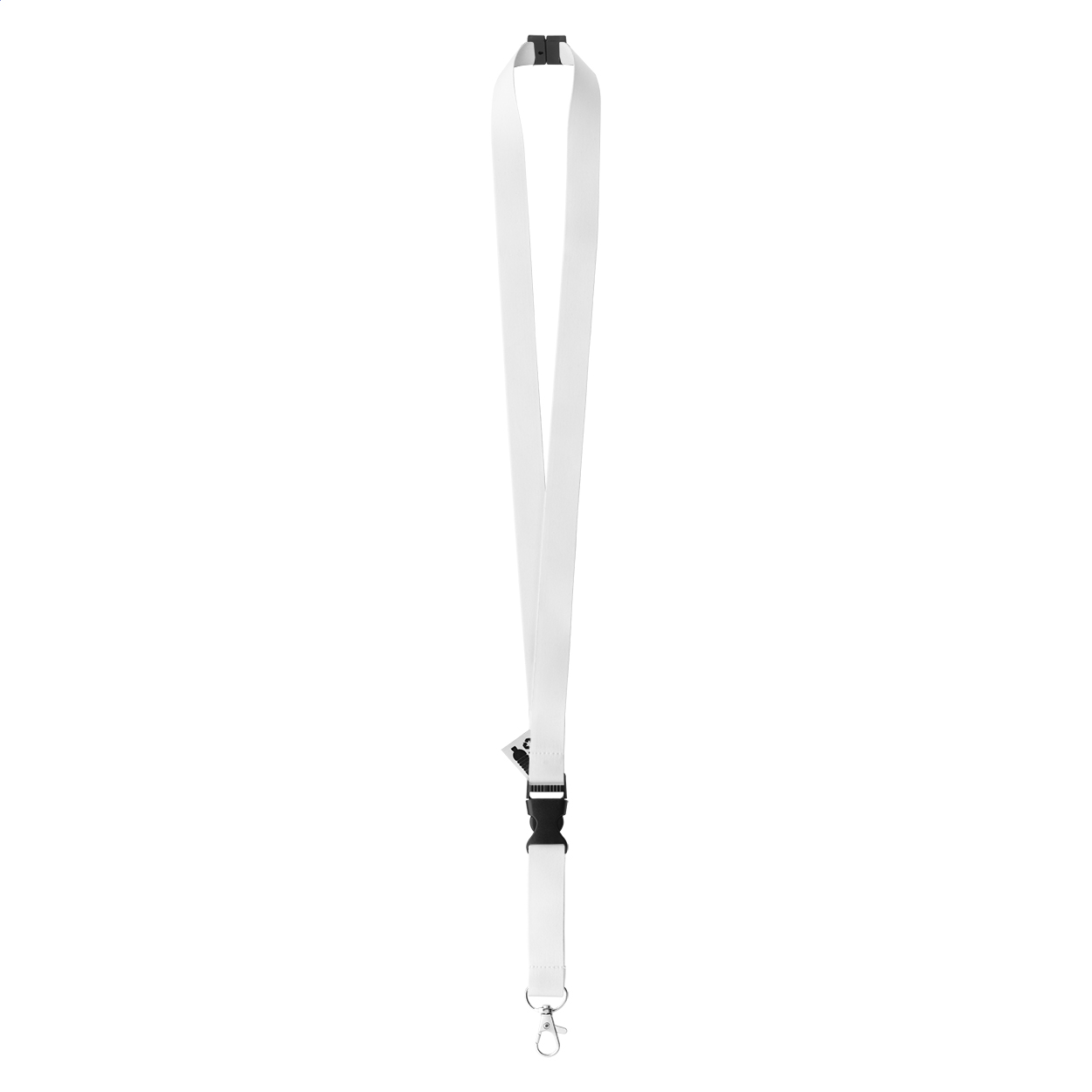 Custom made, RPET lanyard with detachable metal carabiner and safety buckle. With sublimation printed graphics on both sides. MOQ: 100 pcs.