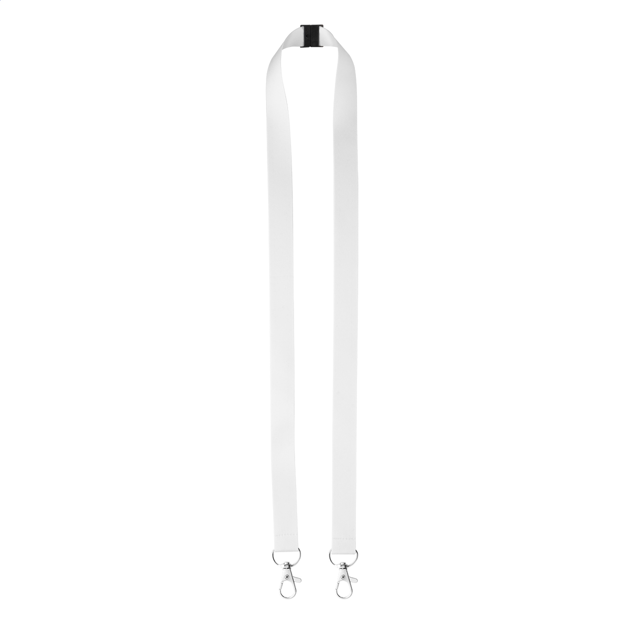 Custom made, polyester lanyard with 2 metal carabiners and safety buckle. With sublimation printed graphics on both sides. MOQ: 100 pcs.