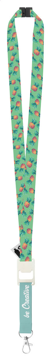 Custom made, RPET lanyard with metal carabiner, bottle opener and safety buckle. With sublimation printed graphics on both sides. MOQ: 100 pcs.
