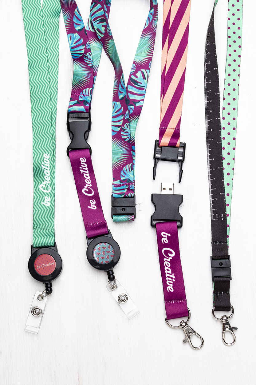 Custom made, polyester lanyard with telescopic badge holder. With sublimation printed graphics on both sides. MOQ: 100 pcs.