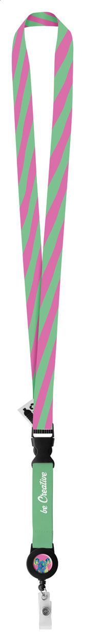 Custom made, wide RPET lanyard with detachable telescopic badge holder. With sublimation printed graphics on both sides. MOQ: 100 pcs.