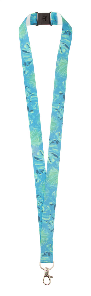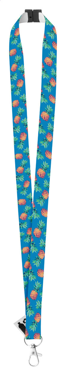 Custom made, RPET lanyard with metal carabiner and safety buckle. With sublimation printed graphics on one side. MOQ: 100 pcs.