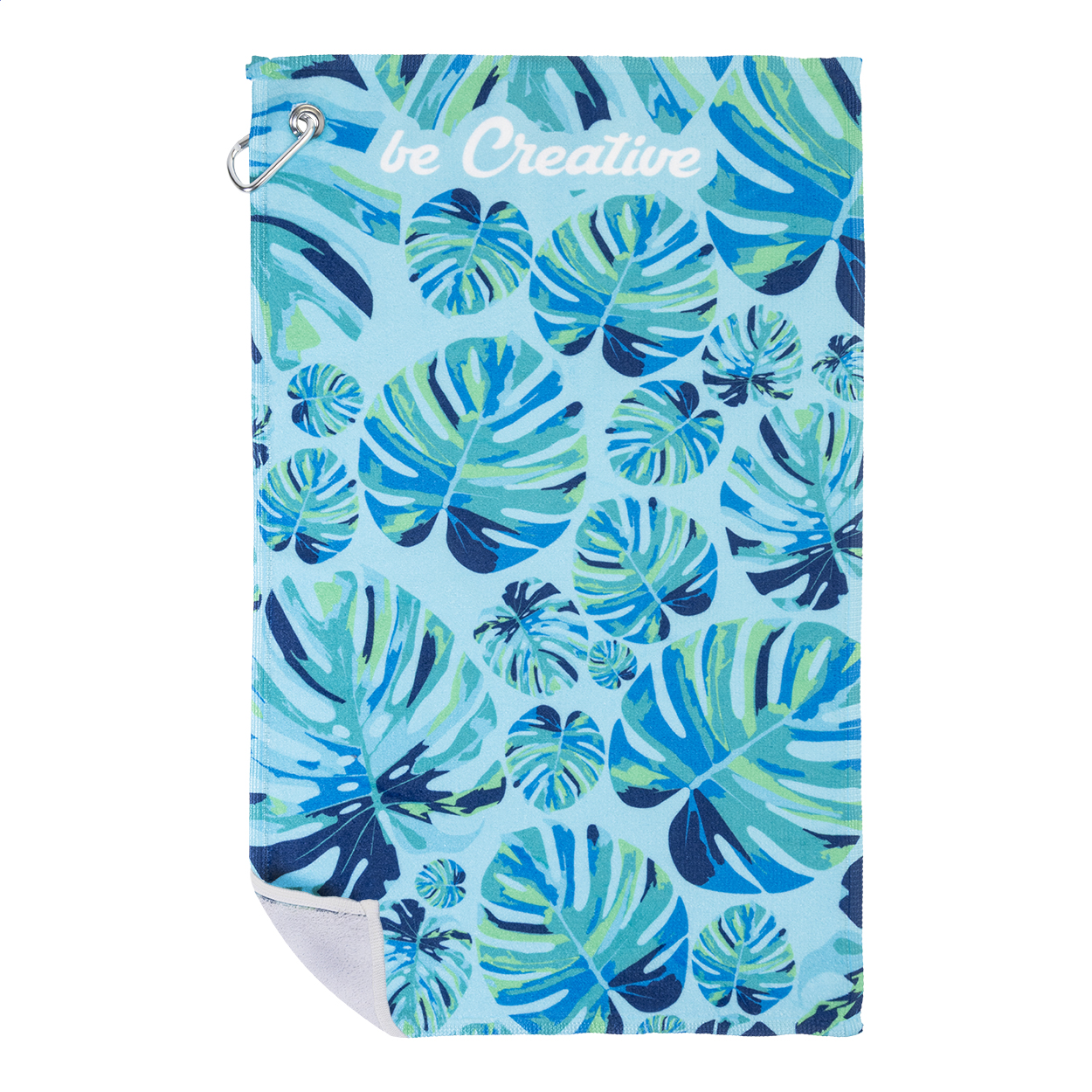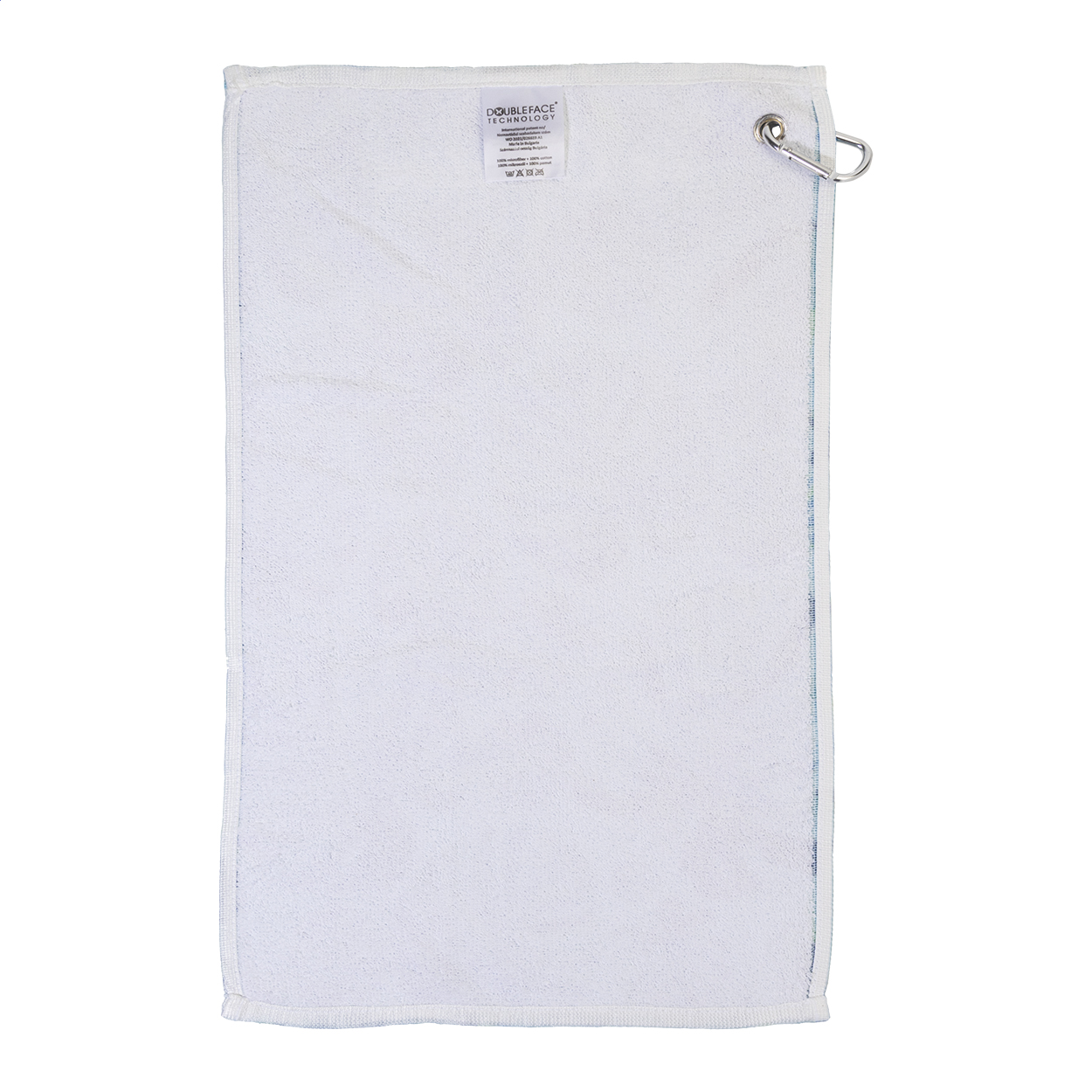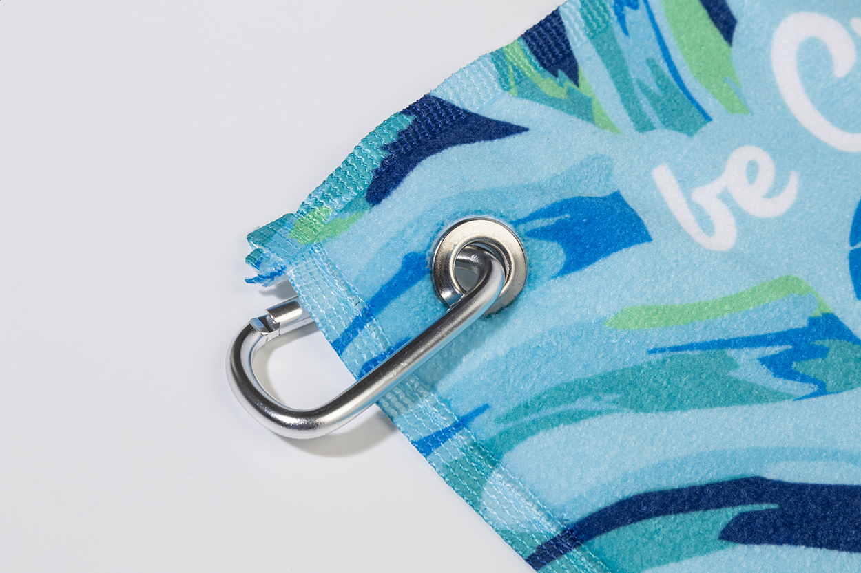 Double face golf towel with metal hanger and sublimation printed graphics on one side. 100% cotton + 100% microfibre, 400 g/m². Price includes sublimation printing. MOQ: 50 pcs.