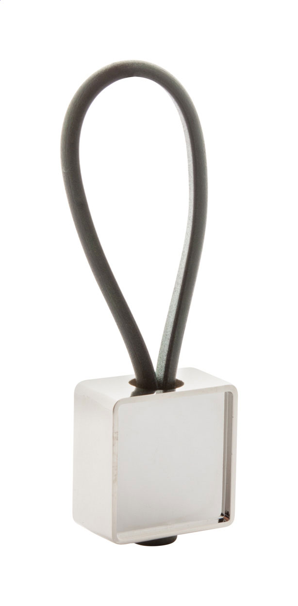 Square shaped metal keyring with black rubber loop and epoxy dome.