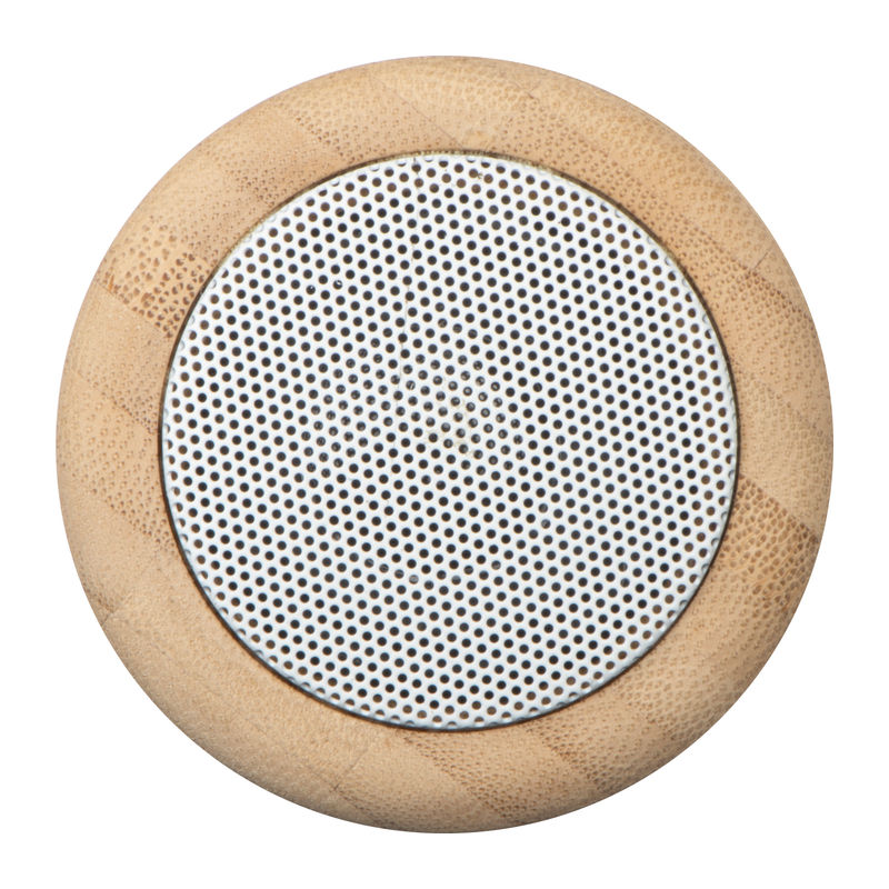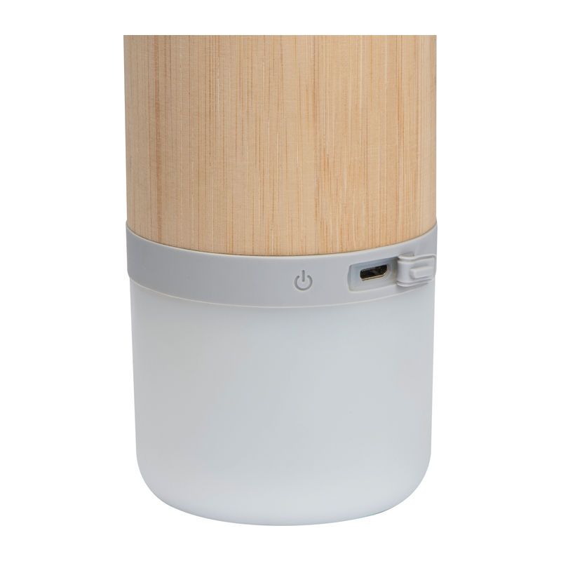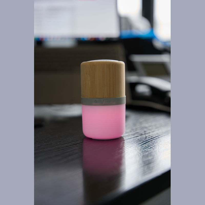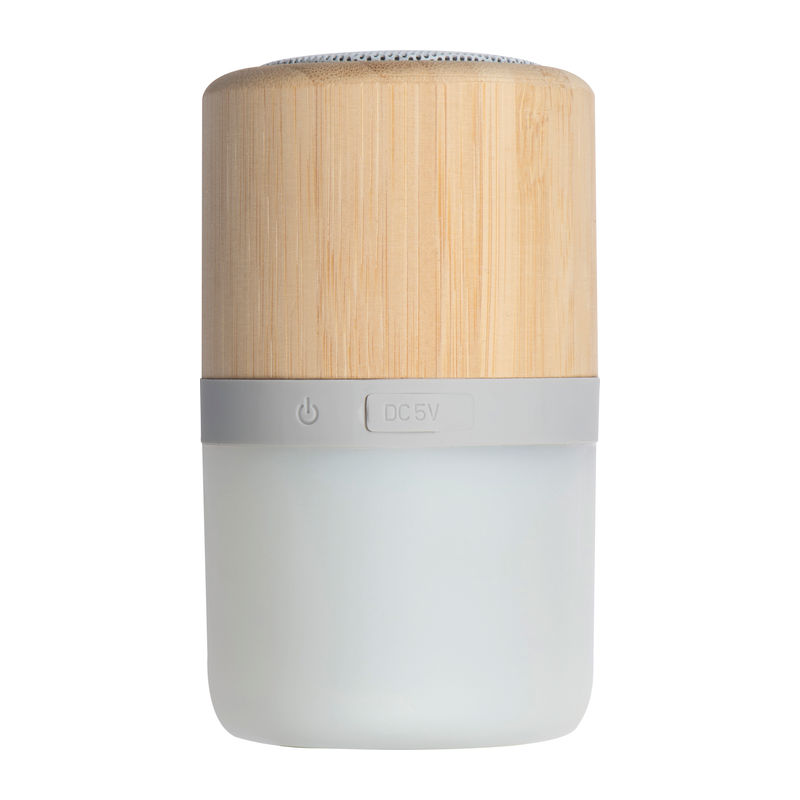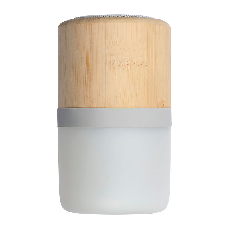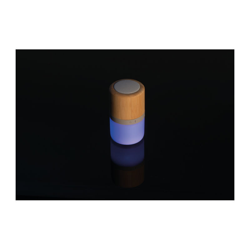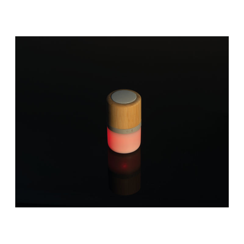 Bluetooth 5.0 speaker crafted from ABS and bamboo, featuring a colour-changing LED light, a 300 mAh battery with a 2-hour charging time, and an operational range of up to 10 metres. Each unit and engraving is unique due to the natural bamboo material.