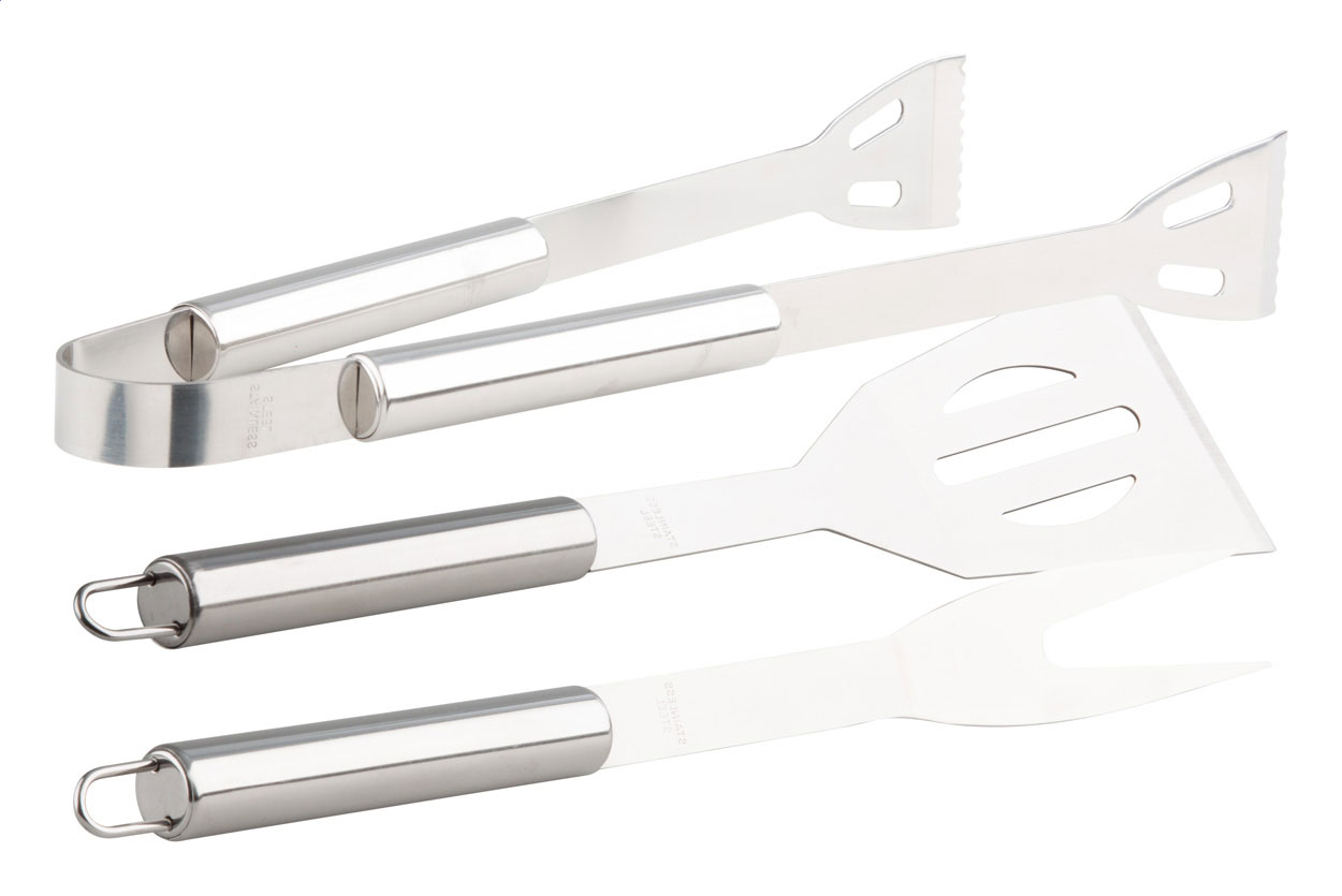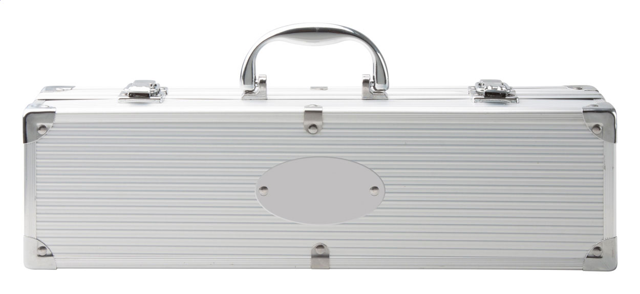 3 pc stainless steel barbecue set (fork, shovel and clip) in aluminium case.