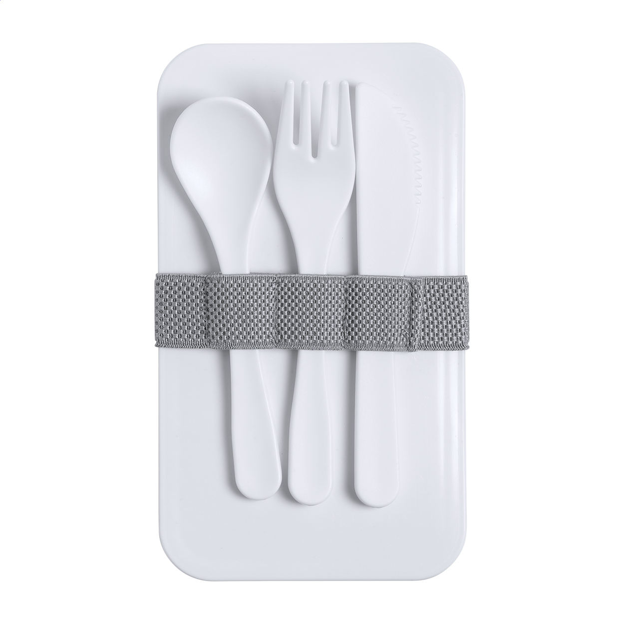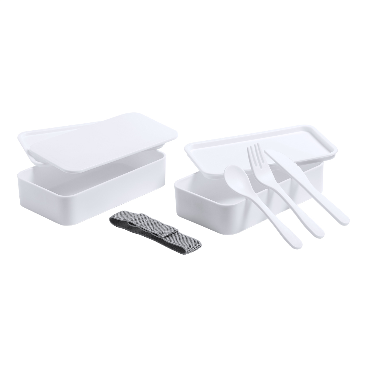 Lunch box in antibacterial plastic with cutlery set (fork, spoon and knife) and elastic strap. With 2 compartments of 700 ml capacity each. ISO 22196 compliant.