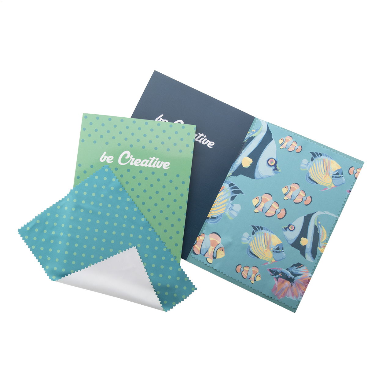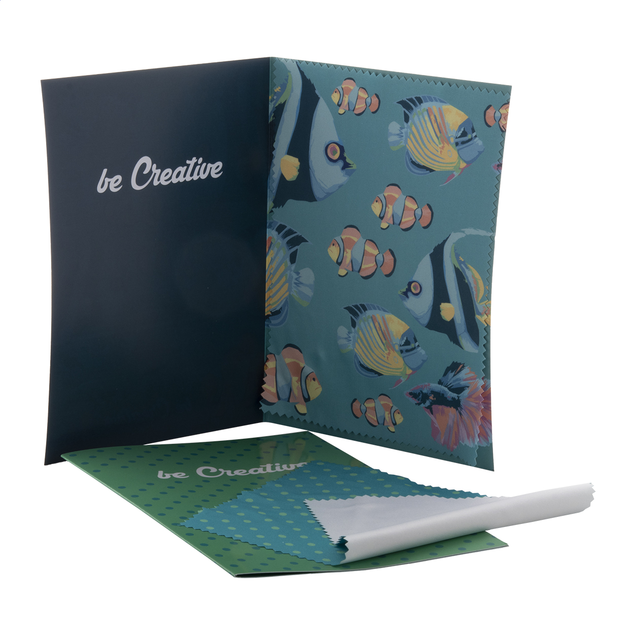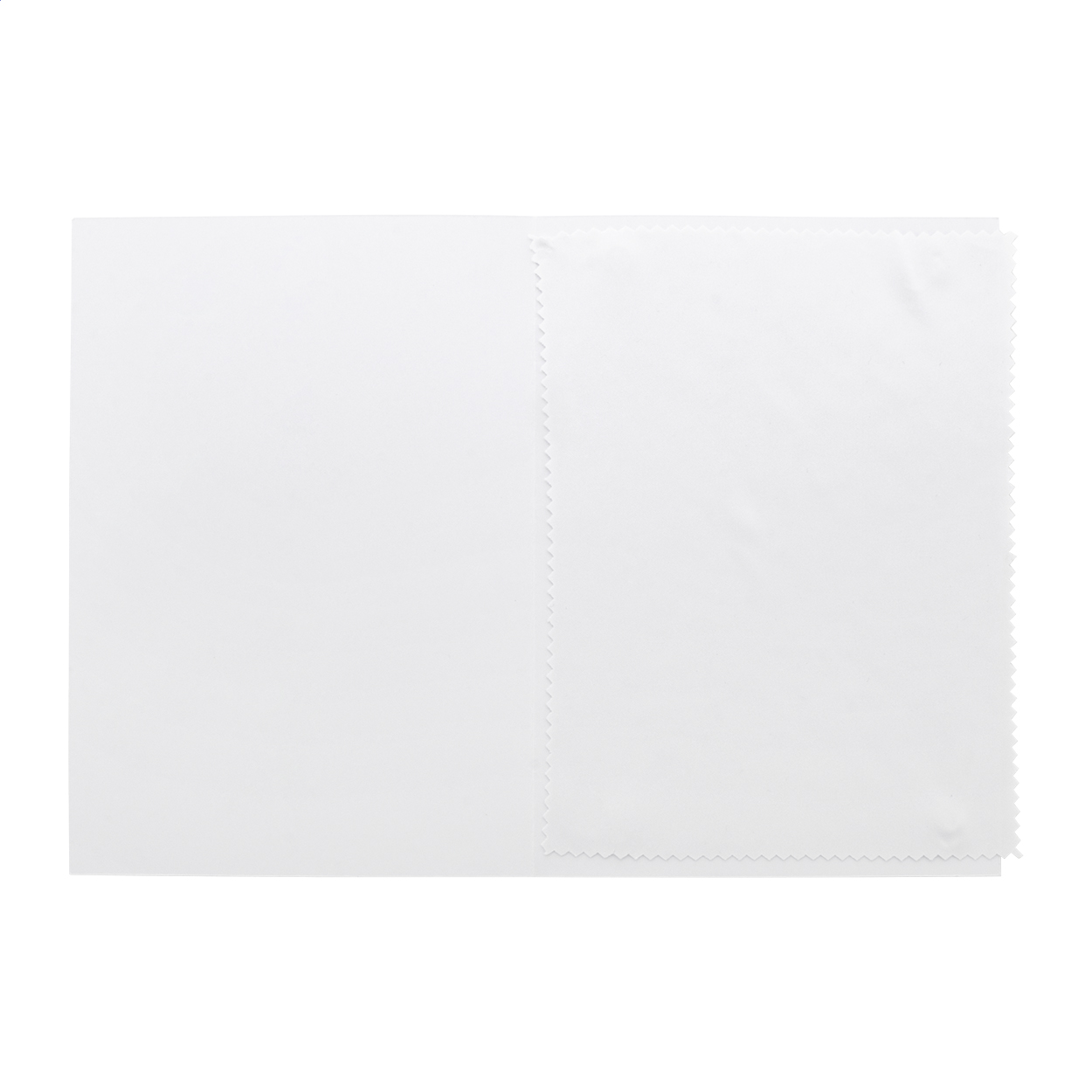Custom made paper postcard with custom graphic on both sides. Including a sublimation printed microfibre (180 g/m²) cleaning cloth for glasses. MOQ: 100 pcs.