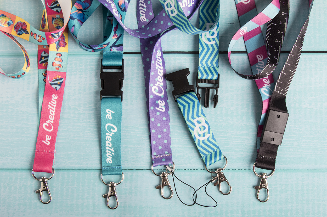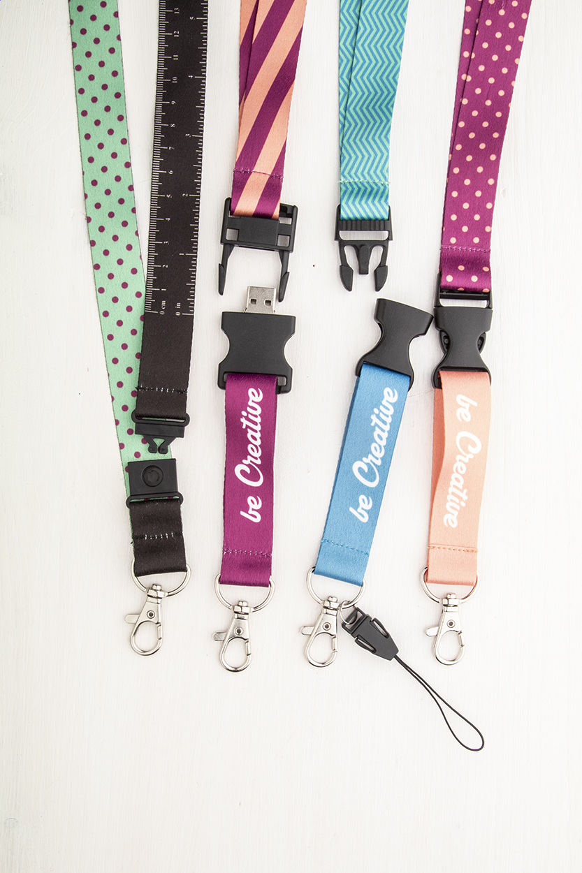 Custom made, polyester lanyard with detachable metal carabiner. With sublimation printed graphics on both sides. MOQ: 100 pcs.
