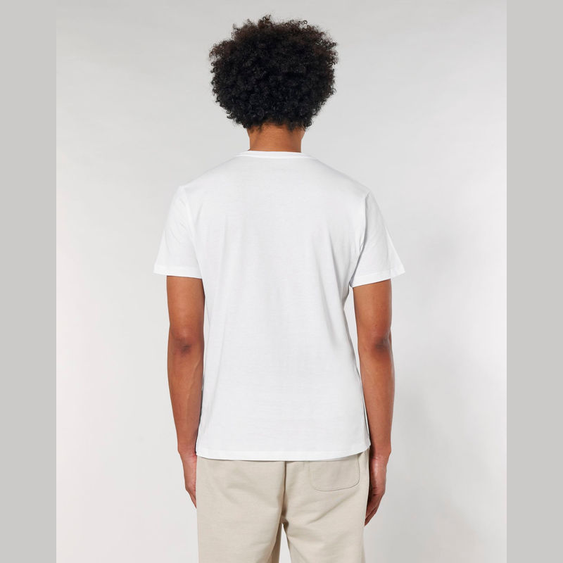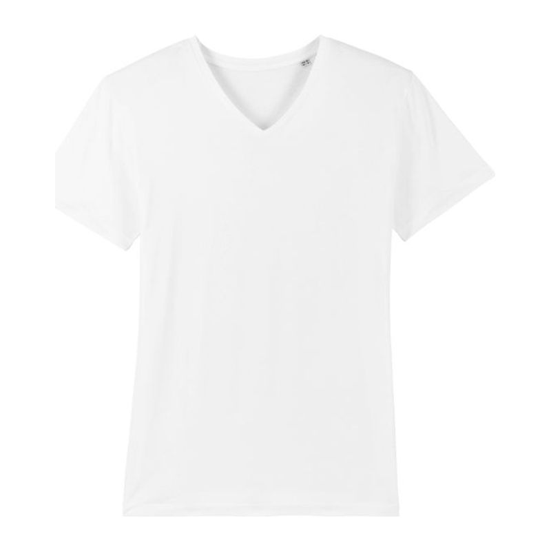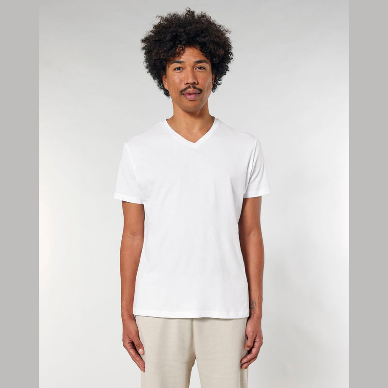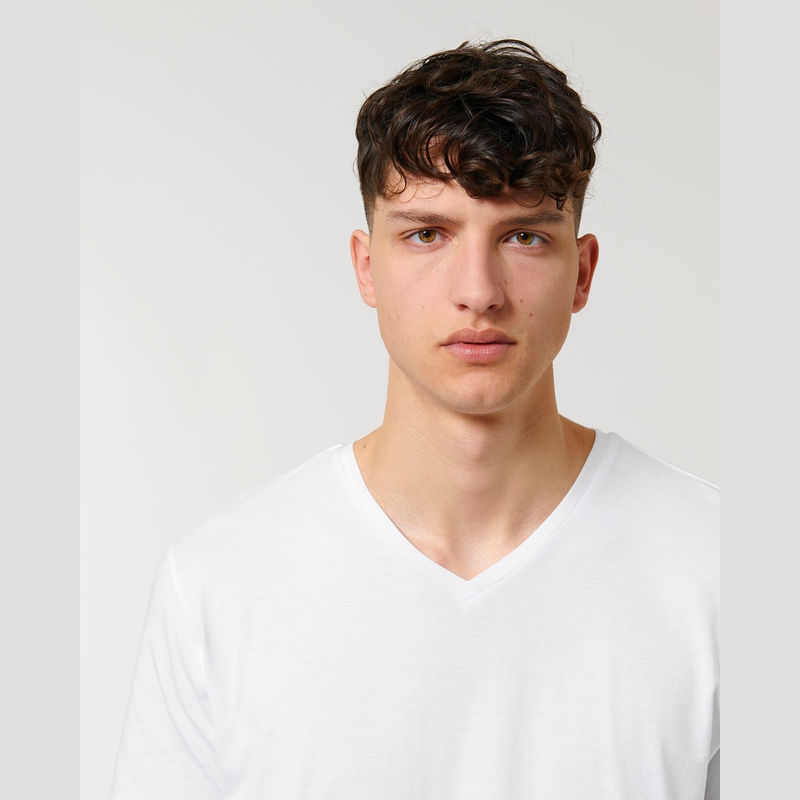 Stylish men's v-neck with set-in sleeves and self-fabric neck collar. Features durable narrow double topstitching at hems for a clean finish. Perfect for everyday wear.