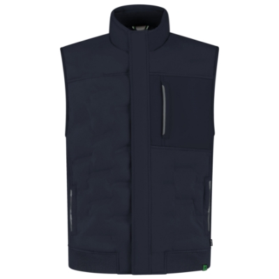 recycled polyester, wind-resistant and water-repellent fabric, modern puffer look, reflective print along the pocket entry and center back, straight cut with side seams, full-length zip with chin protection and storm flap lockable by concealed snaps, stand-up collar, sleeve lines slab-sided with an elastic strip, the left side of the chest is made from softshell fabric, ready for possible printing, zipped chest pocket, with ID loop from inside, welt zip pockets, YYK zip pockets, access for branding, rib knit bottom hem, Tricorp item number: 402710, AVAILABLE ON REQUEST TO OUR SALES DEPARTMENT