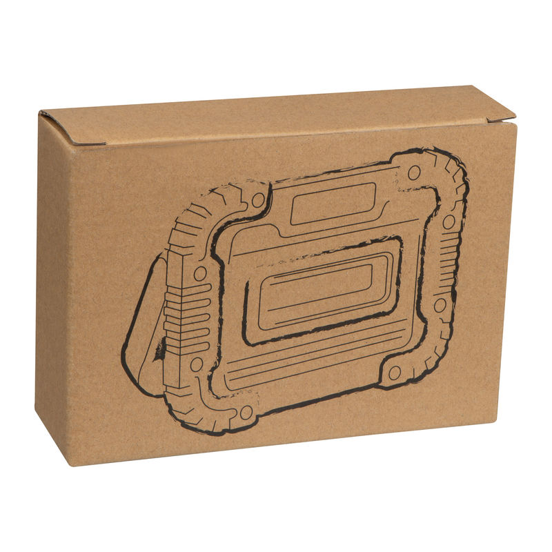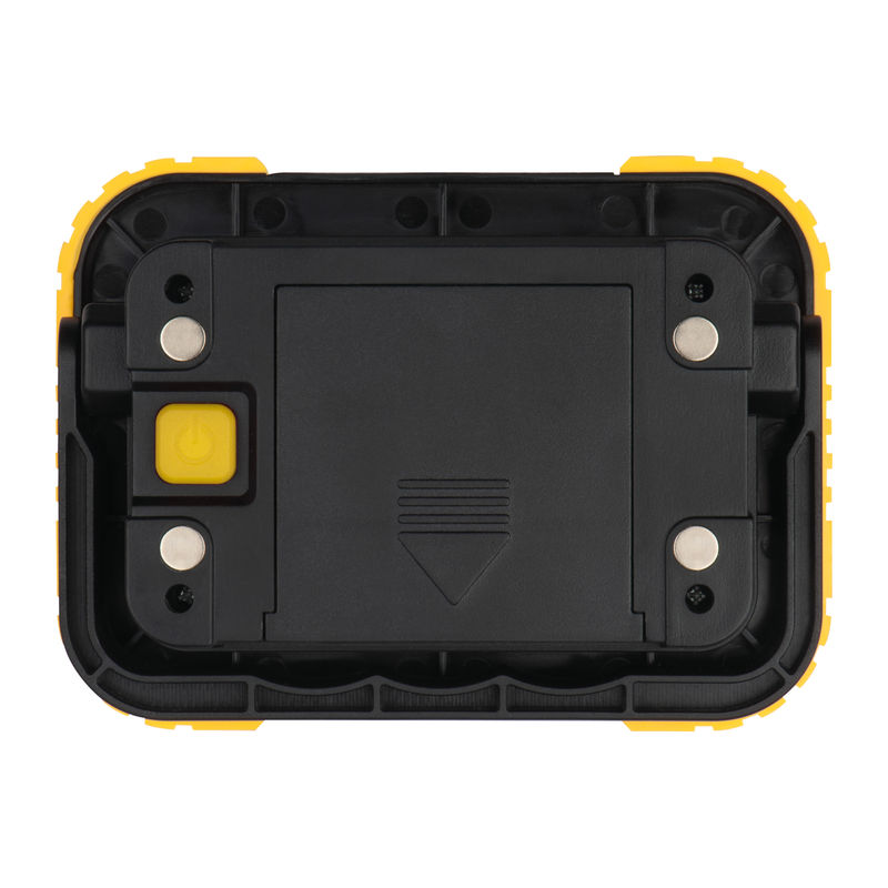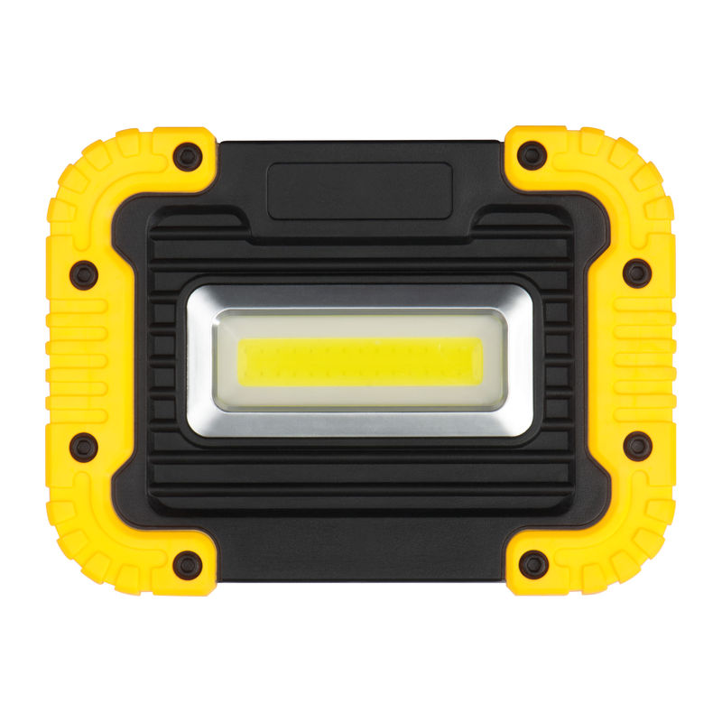 COB construction or work lamp made of plastic with 10 watts of power, 3 lighting functions (floor, SOS and flashing) and a fold-out handle for putting down or carrying. Your logo will be printed above the light.