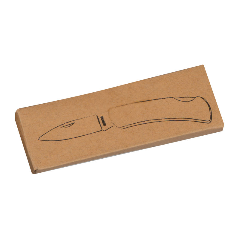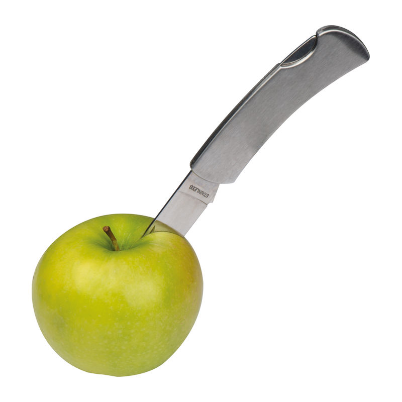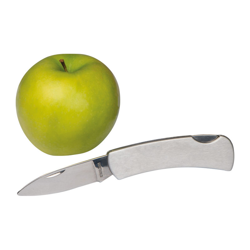 Stainless steel foldable pocket knife with safety lock. We will engrave your logo onto the handle.