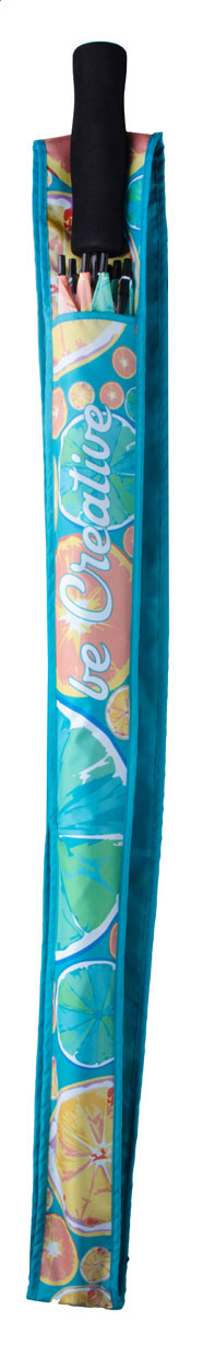 Custom made umbrella carry case with shoulder strap for full-sized umbrellas, 190T pongee. With sublimation printed graphics. MOQ: 50 pcs.
