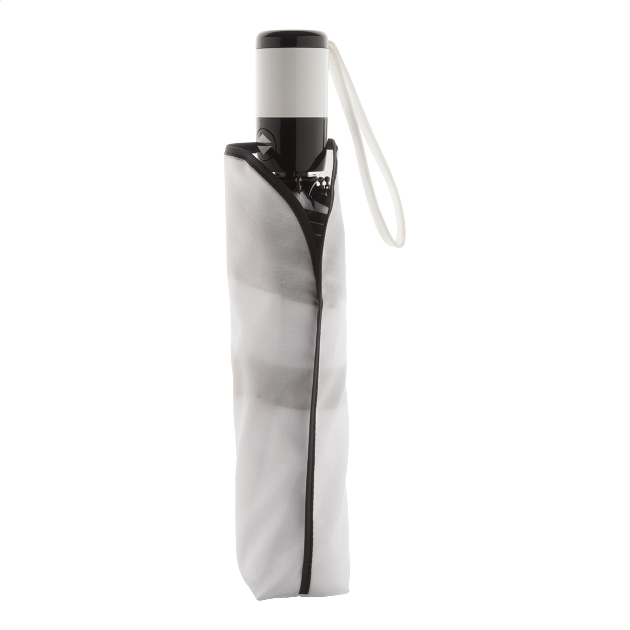 Full automatic (open/close), windproof folding umbrella with 8 panels. With metal shaft, metal/fibreglass frame, matching colour pouch and plastic handle. 190T pongee.