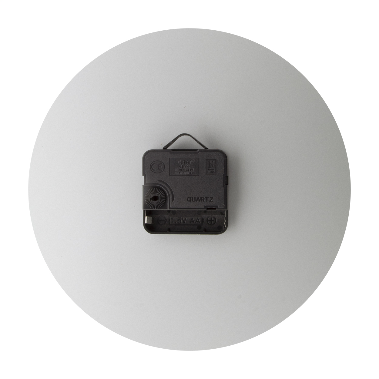 Custom made, brushed aluminium composite wall clock with custom graphic in round shape. Operates with 1 AA battery, without battery. Price includes UV LED printing. MOQ: 25 pcs.
