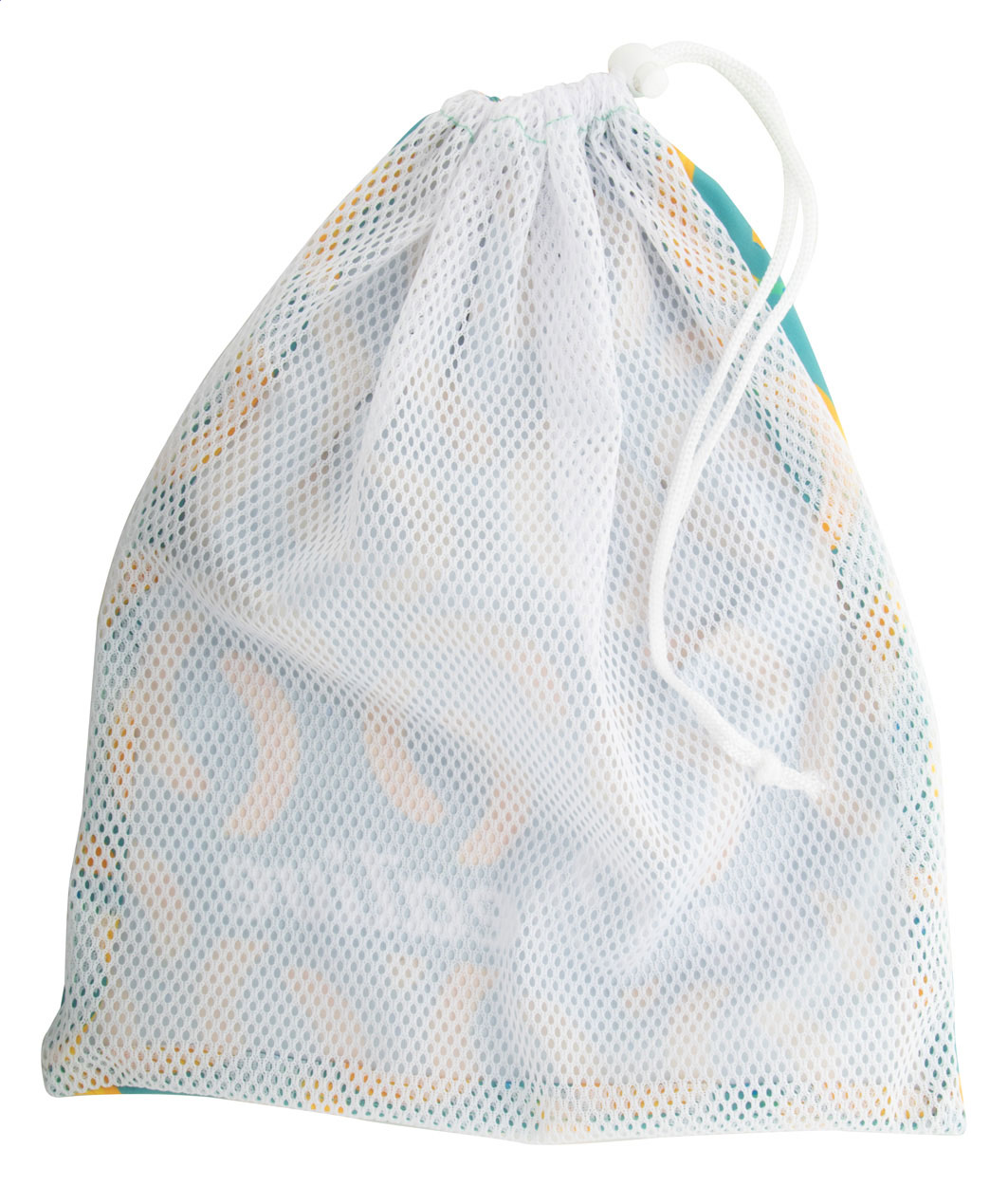 Custom made polyester produce bag with mesh front and drawstring closure. With sublimation printed graphics on the back side. MOQ: 50 pcs.