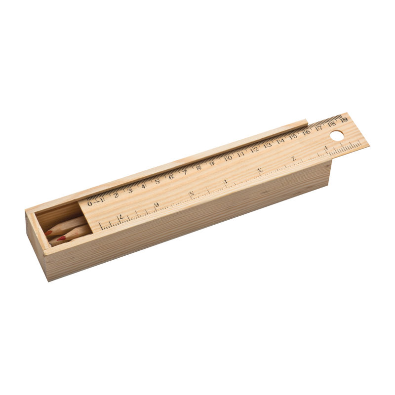 Wooden box* with 8 coloured pencils. The draw-out cover works at the same time as a ruler with cm and inch indication. Your logo can be printed on a side of the box.