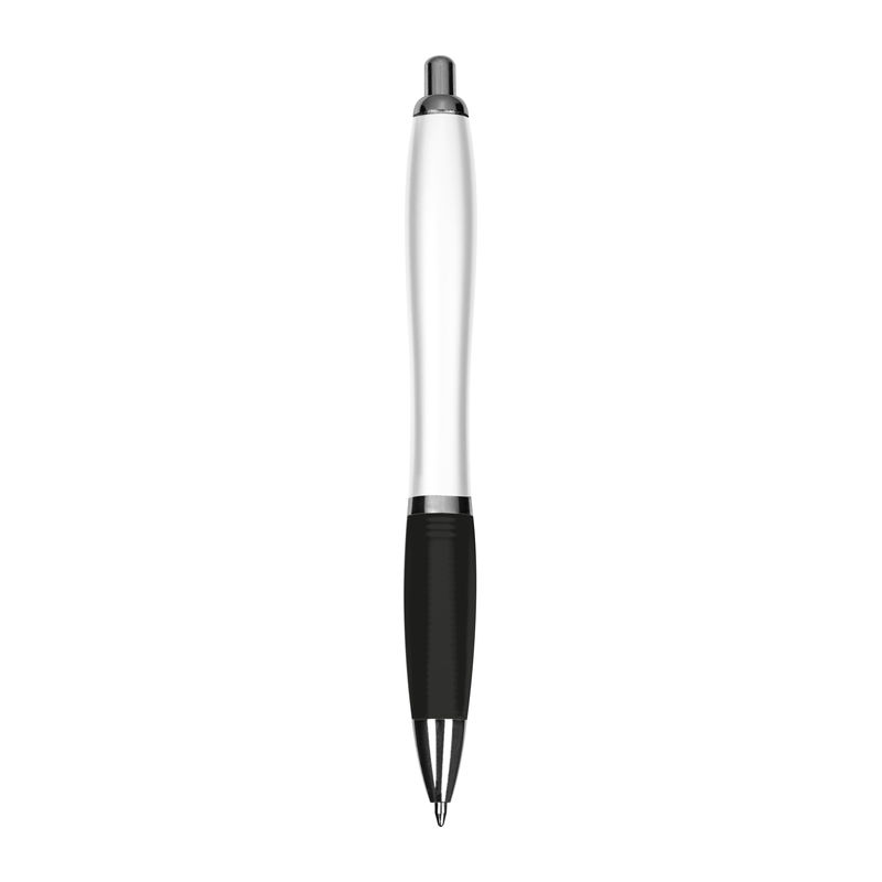 Plastic ball pen with white barrel, metal clip, blue-writing refill, and coloured rubber grip. We will print your logo to the right of the clip.